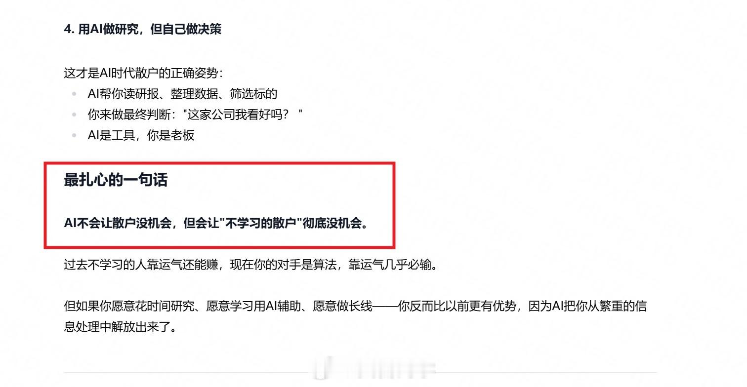 最扎心的一句话 AI不会让散户没机会,但会让"不学习的散户"彻底没机会。