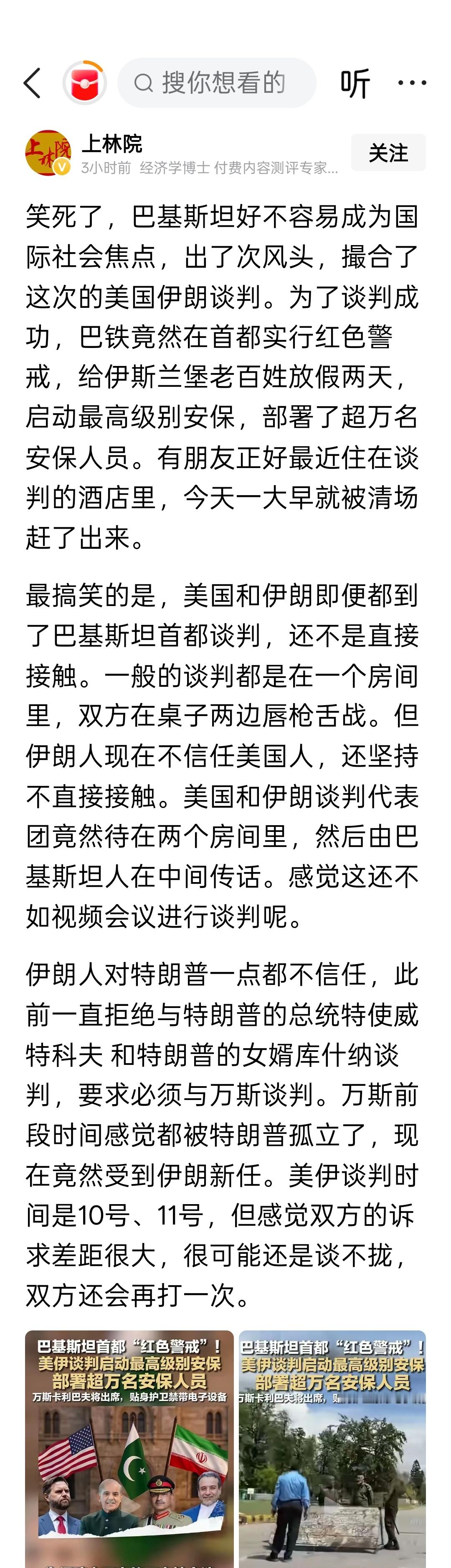 美国伊朗谈判。巴基斯坦在首都实行红色警戒,给伊斯兰堡老百姓放假两天,启动最高级别安保,部署了超万名安保人员。搞笑的是,美国和伊朗即便都到了巴基斯坦首都谈判,还不是直接接触。美国和伊朗谈判代表团竟然待在两个房间里,然后由巴基斯坦人在中间传话。
