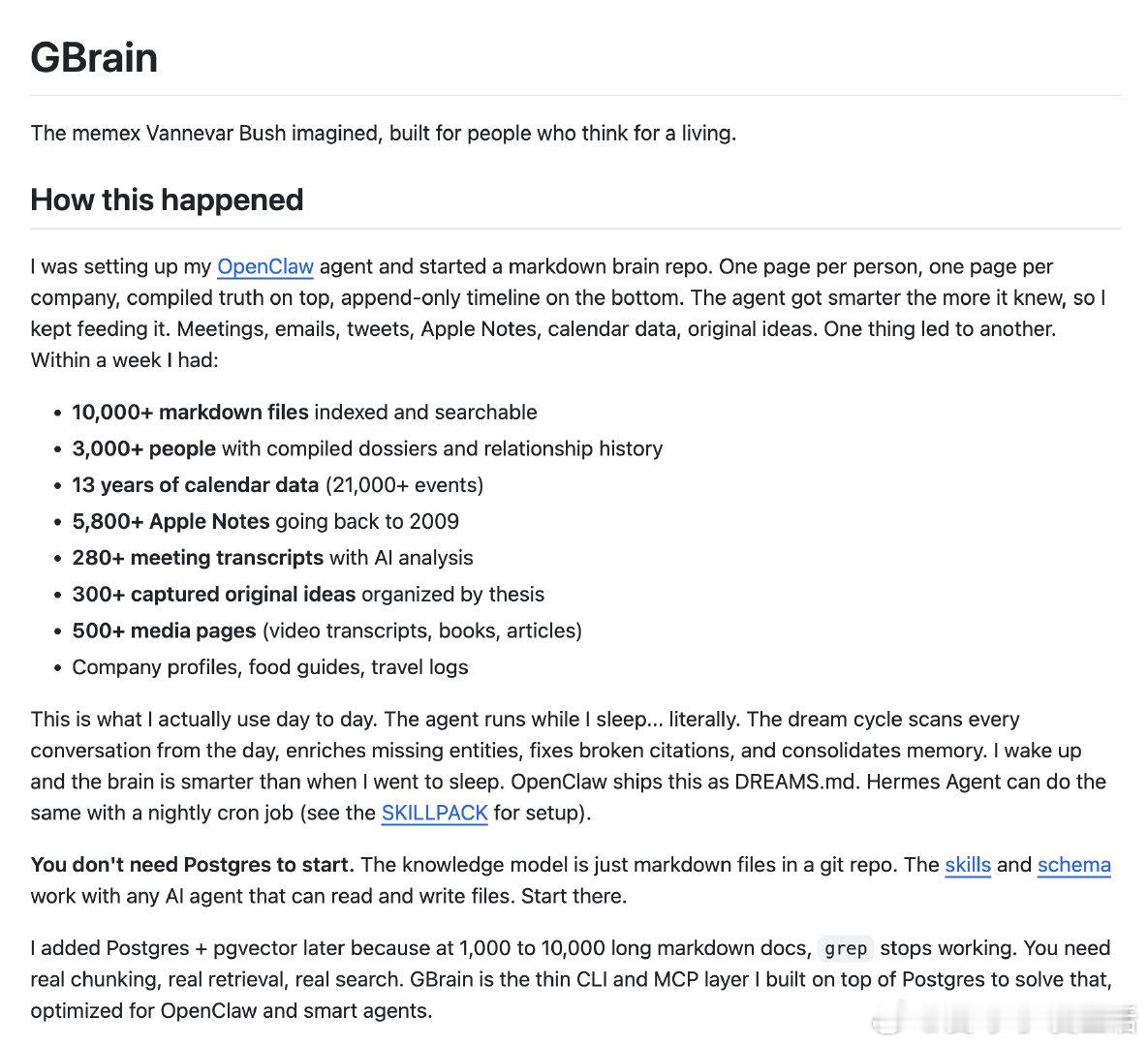 - 混合搜索,支持语义和关键词查询,融合RRF算法;- Markdown知识模型,每页“编译真相”+“追加时间线”,人类可读可编辑;- 实体检测与链接,自动构建3000+人物/公司关系图谱;- 增量同步,支持Obsidian/Notion迁移,git repo即真相源头;- 文件管理,自动迁移二进制到云存储(S3/Supabase),repo瘦身90%;- AI技能包,脑-代理闭环,会议转知识、每日简报、实体丰富管道。
