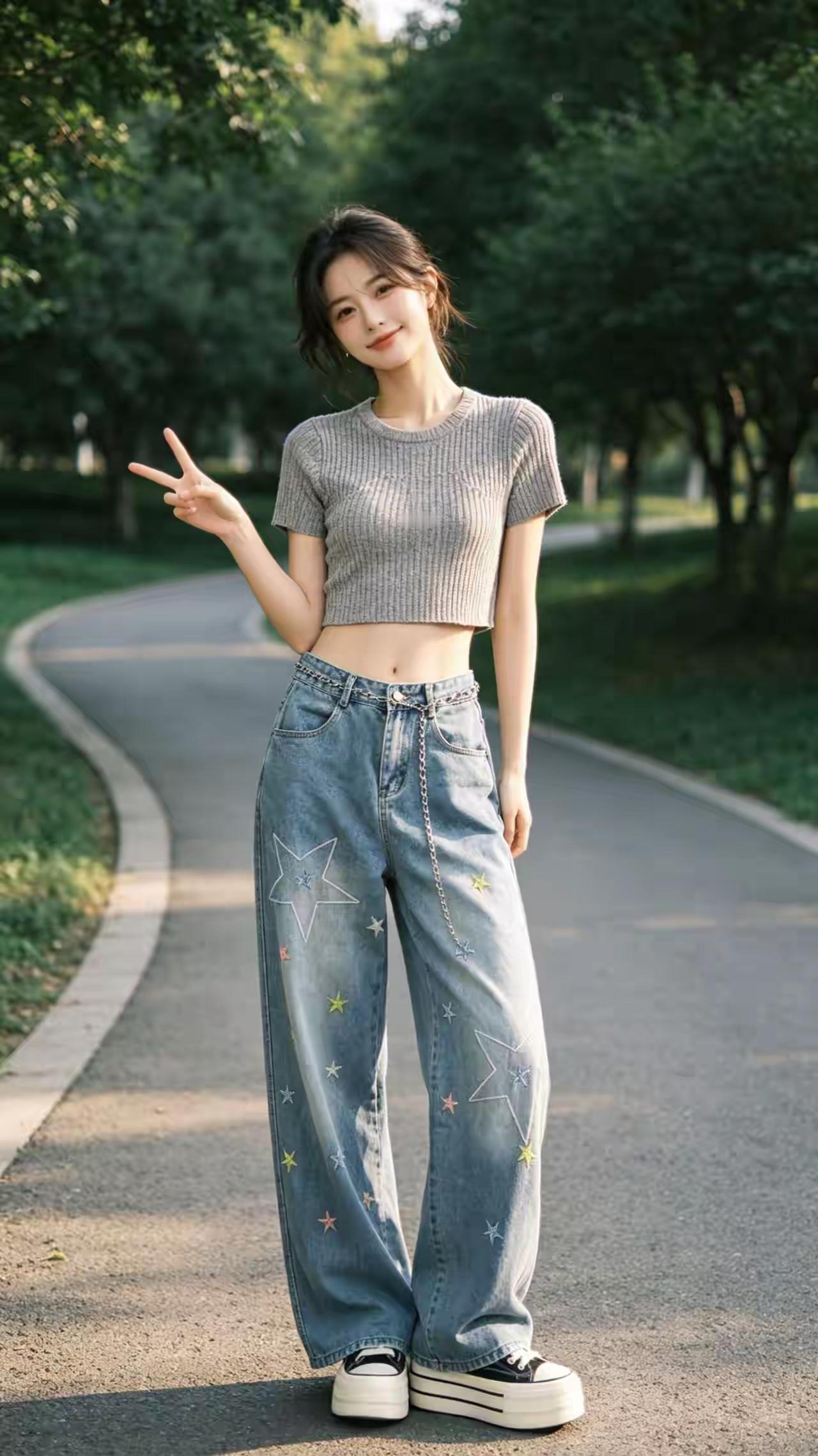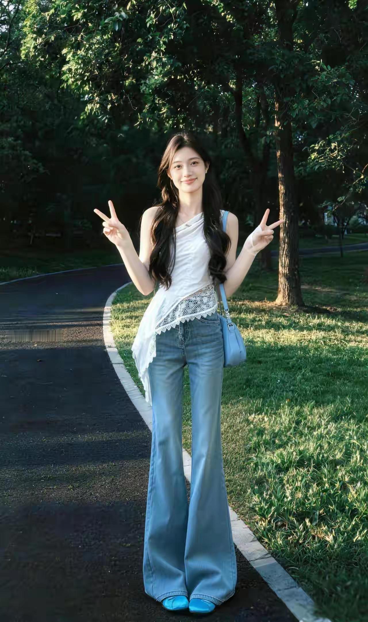 OOTD时尚穿搭今天穿什么ootd水蓝色长袖搭配复古牛仔裤短裤真是活力满满