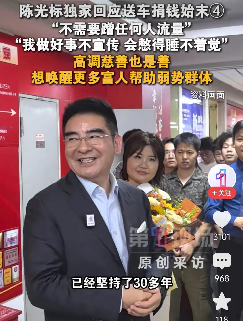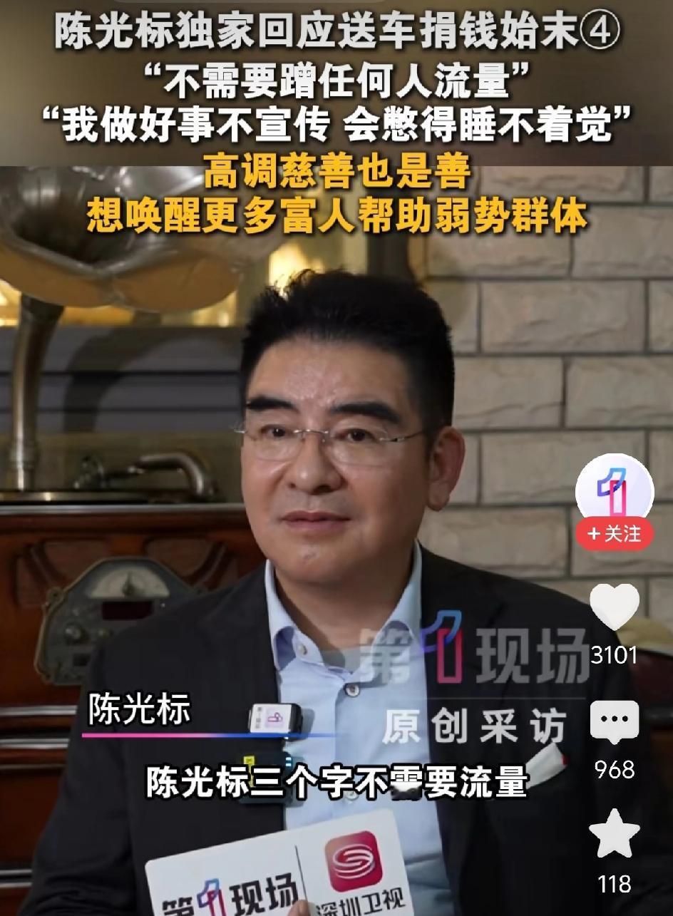 陈光标内心真的真的受伤了,赌了一口气。陈光标说他不需要蹭任何人的流量,他自己的名字就是流量。早在九几年他摆地摊的时候就资助过一个安徽白血病的女孩。他说我如果做了善事,我不让别人知道我就睡不着觉,我就要高调做慈善,这样我才能带动富人做慈善。做慈善对于富人来说就是九牛二毛的事儿,而对于一个需要帮助的人,关系到他的一生和整个家庭。