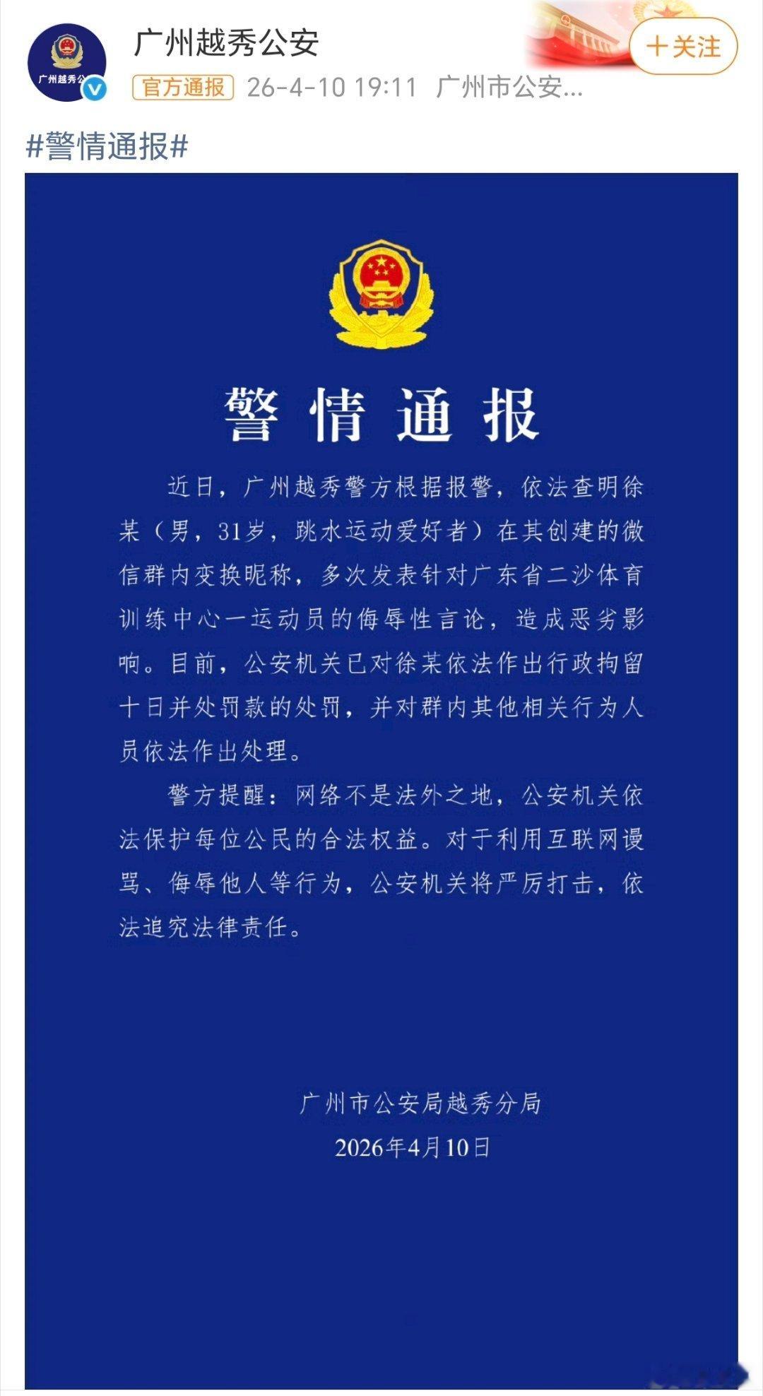 4月10日广州越秀公安发布警情通报:已对徐某进行依法拘留十日并处罚款的处罚,并对群内其他相关行为依法做出处理。