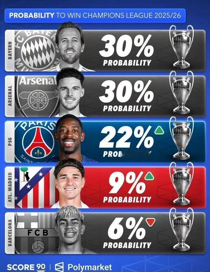 欧冠八强战首回合过后外媒眼中各队的夺冠可能性............马竞的几率是