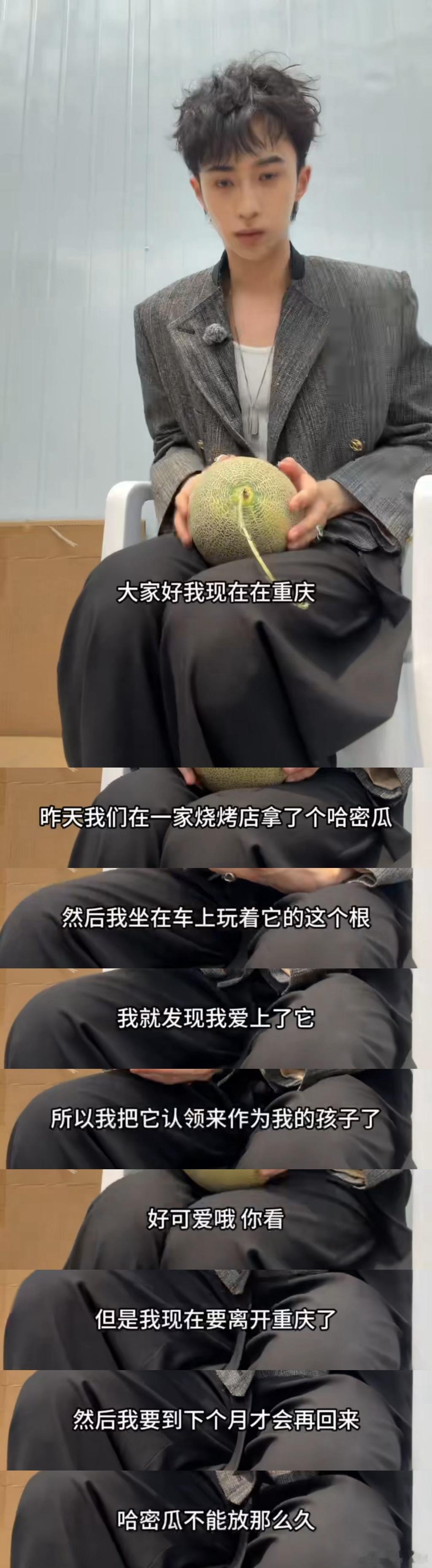 恩利在桃花坞认了个哈密瓜当孩子恩利把哈密瓜当娃认真抱着,走哪儿带哪儿,离开重庆还