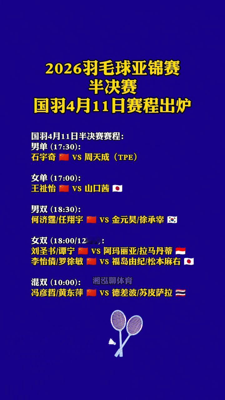 2026羽毛球亚锦赛半决赛,国羽4月11日赛程出炉。