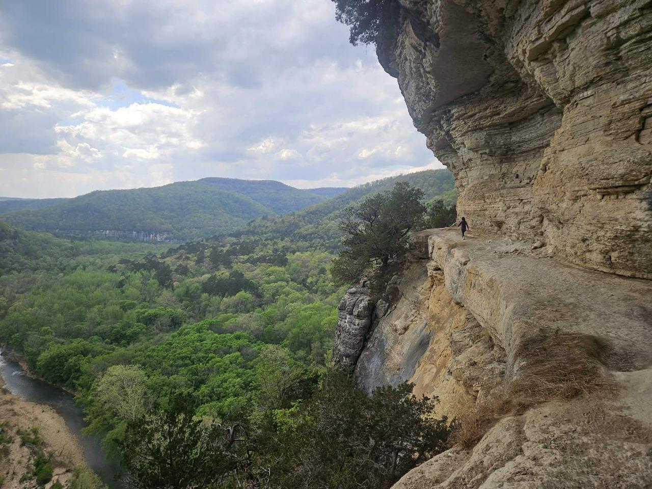 这是阿肯色州‘山羊小径’的风景照,发帖网友的妻子和女儿在此徒步。这条小径以壮丽景色和趣味性著称,是当地受欢迎的徒步路线。奥扎克地区风景优美,但蜱虫问题严重,例如在布法罗河步道三天徒步中可能遇到约25到30只蜱虫。二月冰暴后需等待冰雪融化才能安全通行,徒步时还可能遇到野猪。