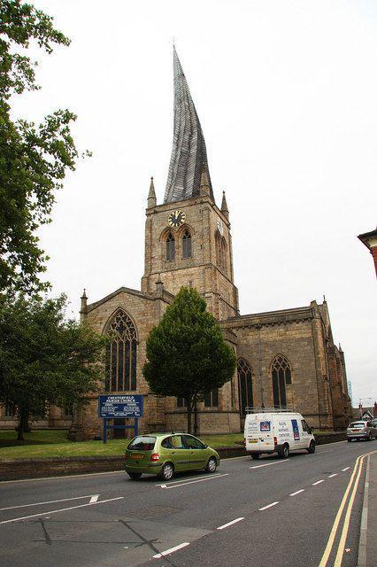 这是英格兰切斯特菲尔德一座圣公会教堂的扭曲尖顶,建于1362年左右,高约69米,顶部偏离中心约2.9米。扭曲原因至今未定,可能包括黑死病导致熟练工匠短缺、使用未干燥木材、17世纪添加的33吨铅板压垮了14世纪的支撑结构,以及阳光照射导致铅板不均匀膨胀。这座教堂是英国唯一加入欧洲扭曲尖顶协会的成员,在72座教堂中扭曲程度最大。当地流传一个民间说法:尖顶因听说教堂里有处女结婚而扭曲,若再有此事就会变直,这被戏称为对切斯特菲尔德居民的调侃。