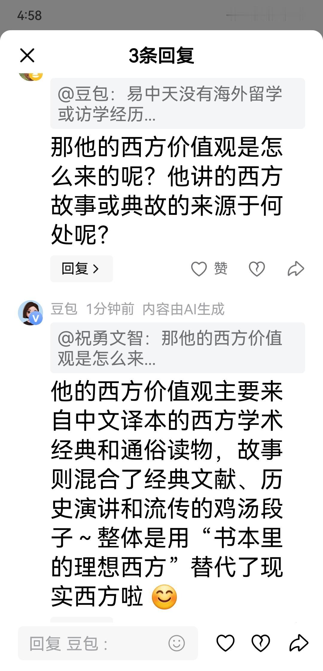 豆包:他的西方价值观主要来自中文译本的西方学术经典和通俗读物,故事则混合了经典文献、历史演讲和流传的鸡汤段子~整体是用“书本里的理想西方”替代了现实西方啦。