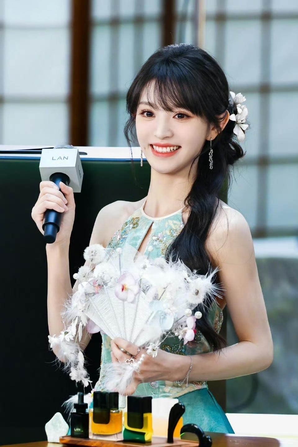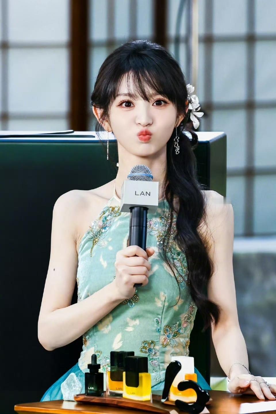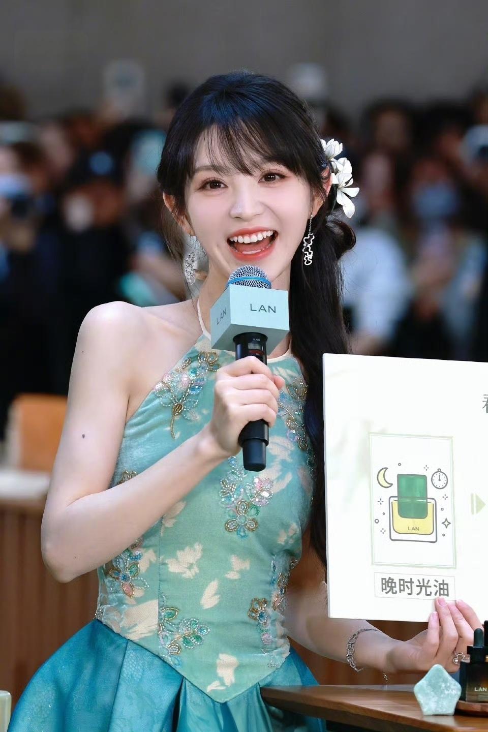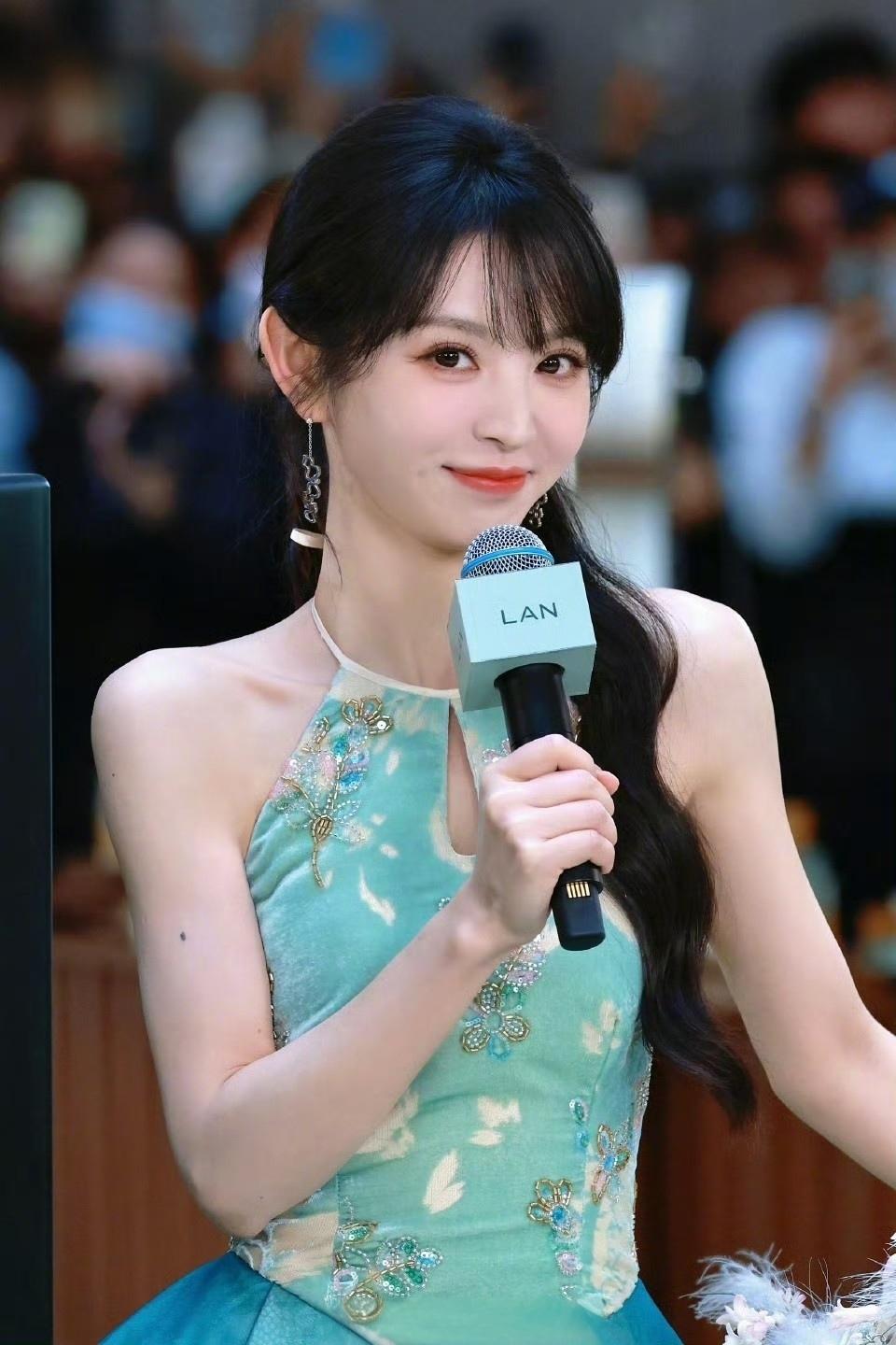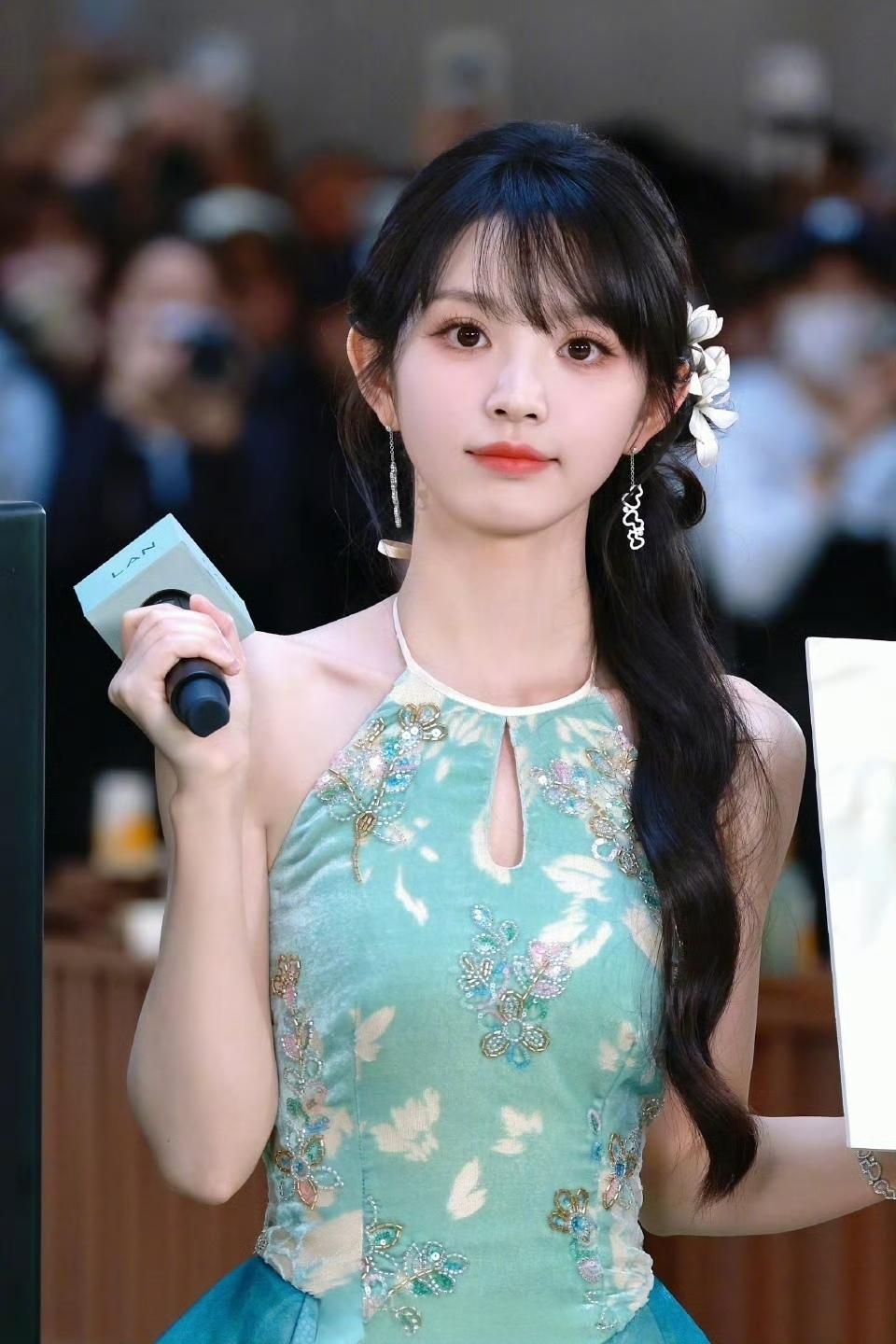 田曦薇 ,身穿天青色花苞裙,精致刺绣与印花交叠,裙身如青花瓷瓶绽放,清新雅致,完