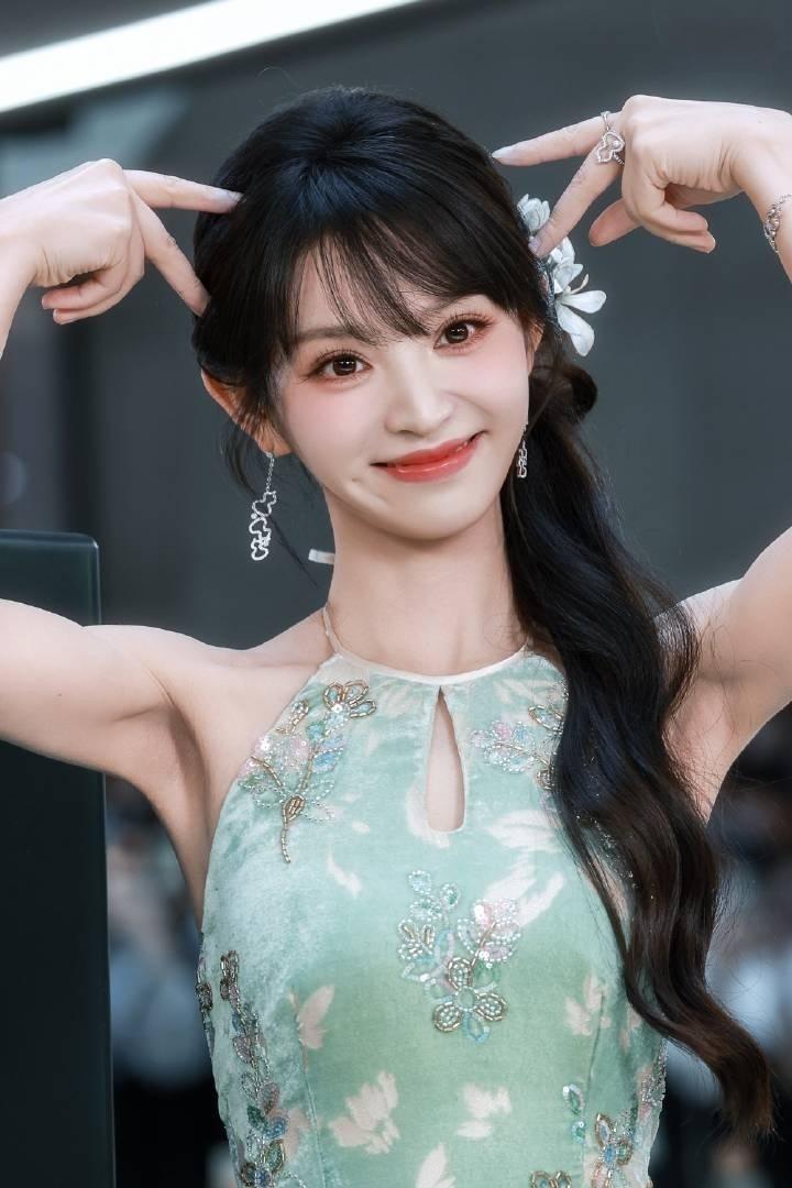 田曦薇 ,身穿天青色花苞裙,精致刺绣与印花交叠,裙身如青花瓷瓶绽放,清新雅致,完美诠释东方雅韵 。
