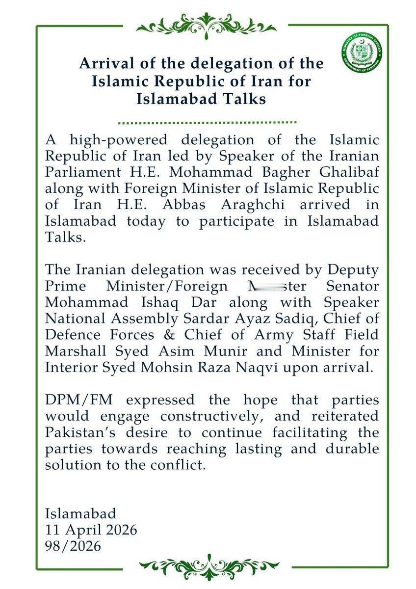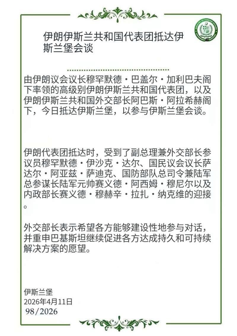 当地时间4月11日,巴基斯坦官方发布声明:“伊朗伊斯兰共和国代表团抵达伊斯兰堡会谈。