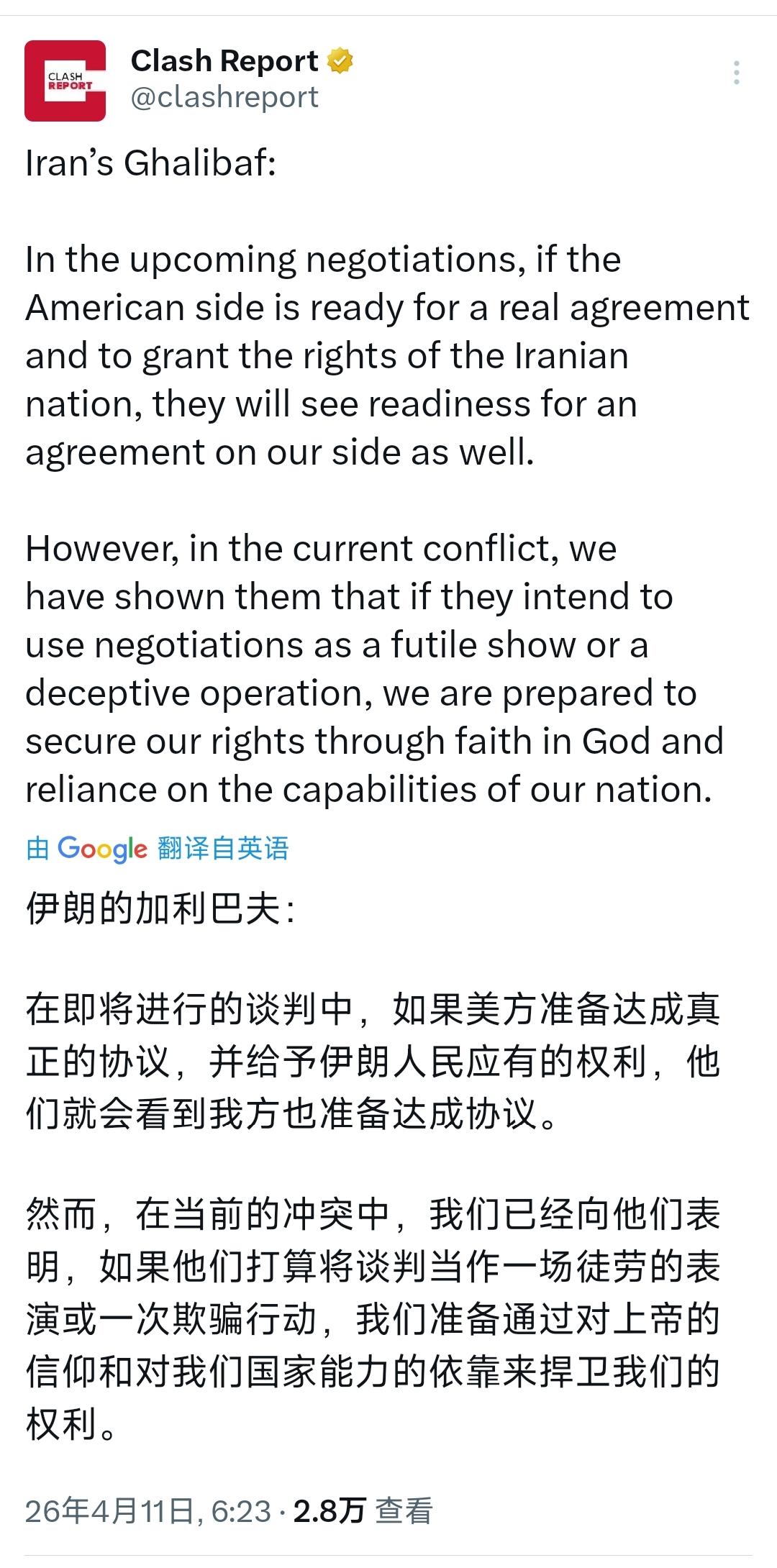 伊朗议会议长卡利巴夫今天(北京时间4月11日)表示:“在即将进行的谈判中,如果美方准备达成真正的协议,并给予伊朗人民应有的权利,他们就会看到我方也准备达成协议。