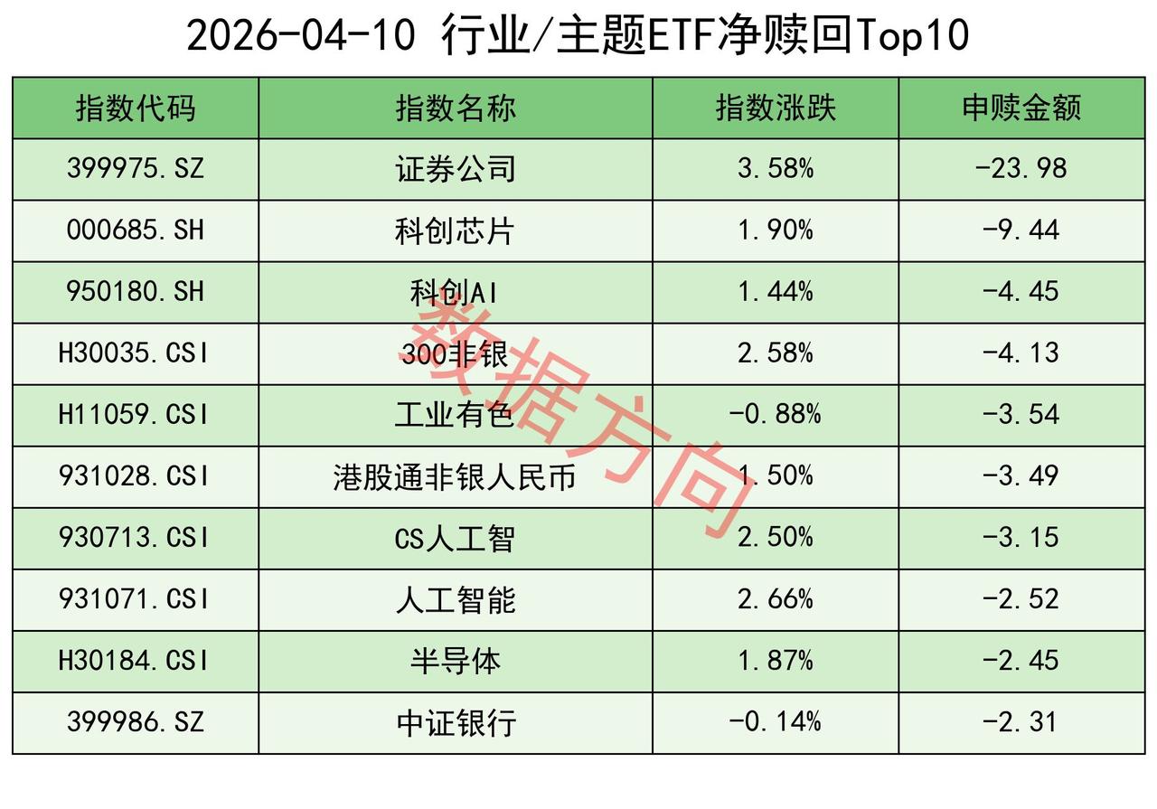 不要高兴太早,ETF连续两天大幅净赎回 4月10日星期五,大盘放量上涨,券商,