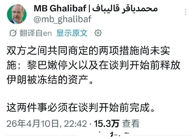 除此之外,根据伊朗代表人卡利巴夫说法,他们还有一个非常坚定的决心,就是美伊谈判美必须要先答应两个条件,伊朗议会议长卡利巴夫表示:一是黎巴嫩停火,二是谈判开始前解冻伊朗被冻结的资产。这两项事宜必须在谈判开始前得到解决。不知道特朗普同意没有这两个条件,相信特朗普已经同意了,要不然伊朗代表团也不会过来吧!当然了要是这次再谈判不成功的话,那么接下来美伊冲突会持续更长的时间,这样对谁都不会有什么好处。