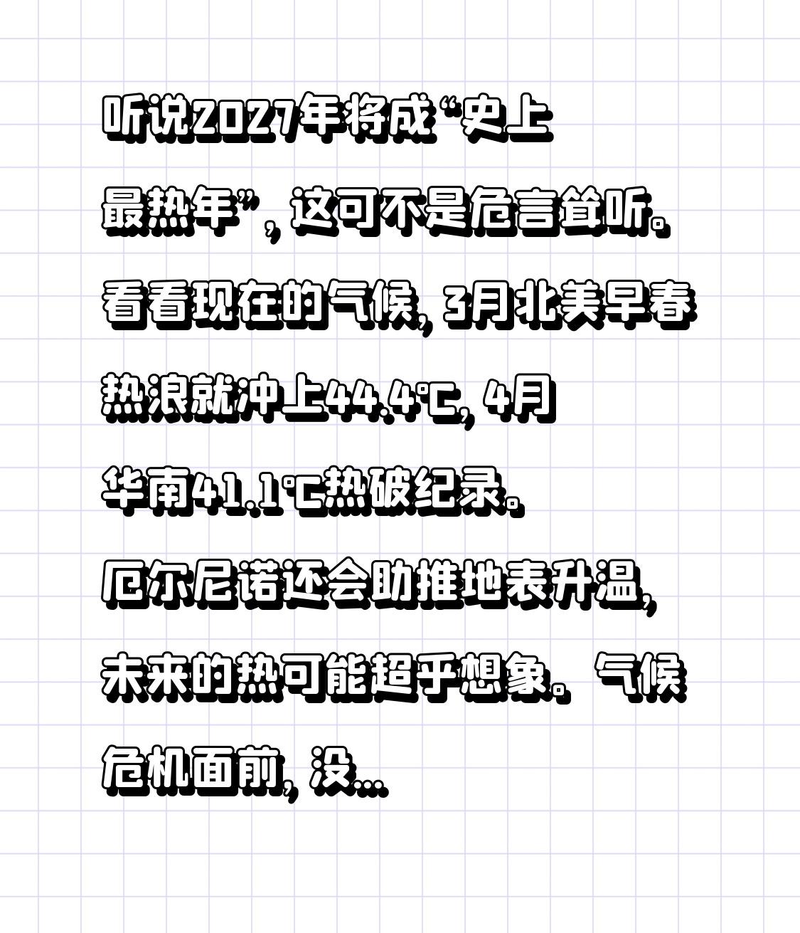 听说2027年将成“史上最热年”,这可不是危言耸听。看看现在的气候,3月北美早春热浪就冲上44.4℃,4月华南41.1℃热破纪录。厄尔尼诺还会助推地表升温,未来的热可能超乎想象。