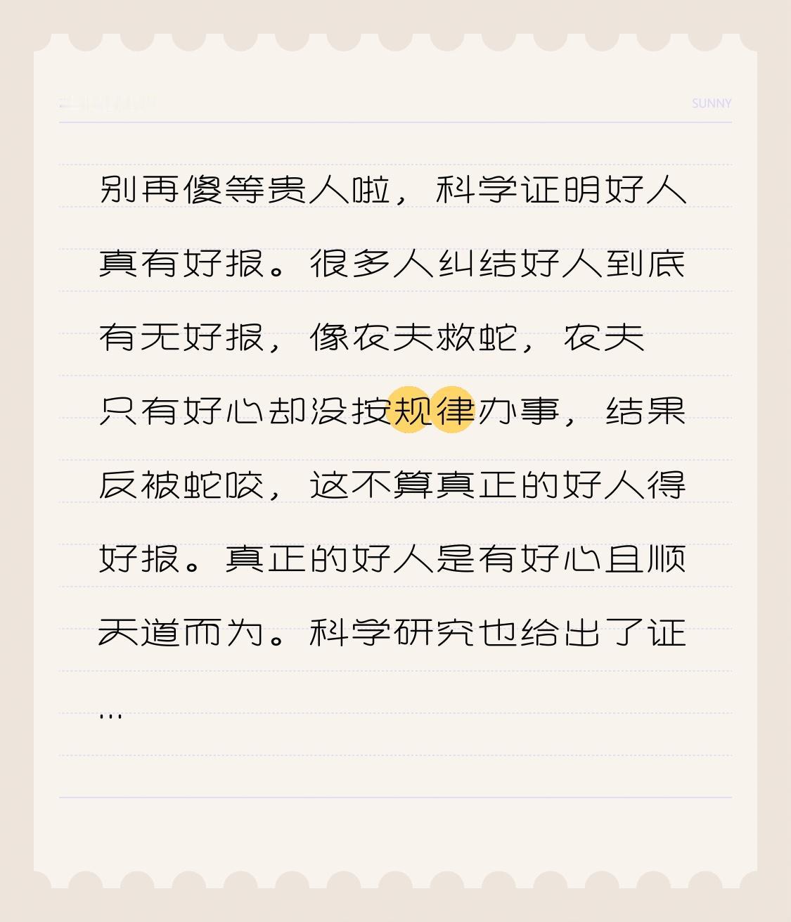 别再傻等贵人啦,科学证明好人真有好报。很多人纠结好人到底有无好报,像农夫救蛇,农夫只有好心却没按规律办事,结果反被蛇咬,这不算真正的好人得好报。真正的好人是有好心且顺天道而为。