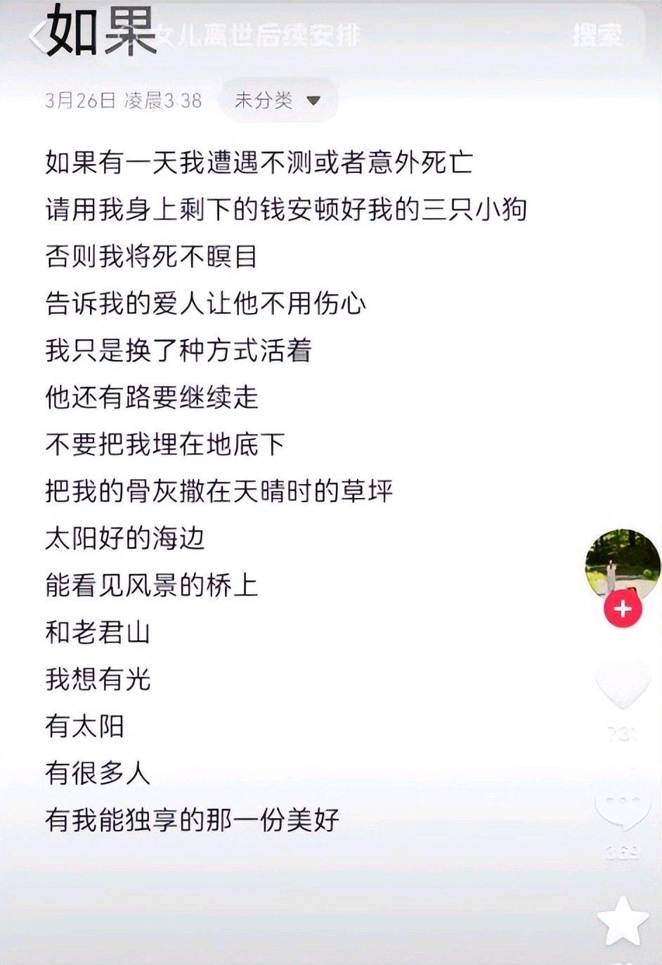 她上月就写好了遗书,凌晨三点独自和痛苦对话,还惦记着安顿好三只小狗,善良得让人心酸。其实早在3月16日,她最后一条动态就有了端倪,说自己睡眠不好。