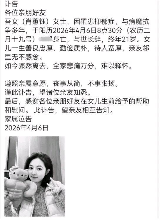 21岁的广东女孩肖蕙钰因抑郁症离世,真的太让人痛心。她在社交平台上是元气满满、笑容灿烂的女孩,朋友圈满是美食、旅行和姐妹合照,谁能想到她被抑郁症纠缠多年。