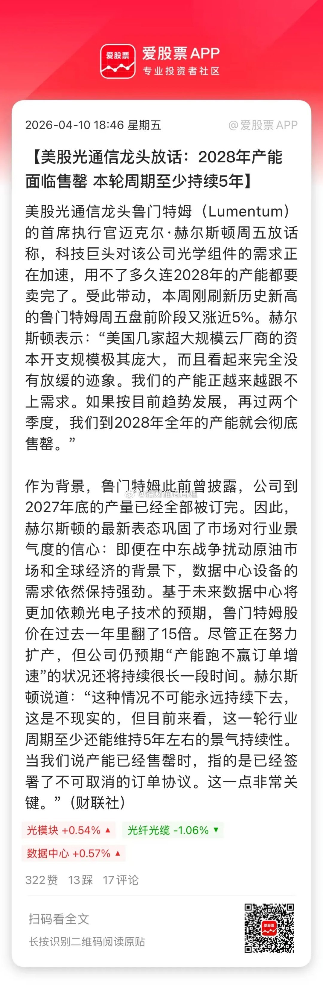 光通信、光模块现在太猛了,美股巨头放话2028年产能面临售罄。这跟存储芯片一样紧缺了啊!原因还是老美巨头硬件投入太疯狂了,光是2026年,亚马逊、微软、谷歌和Meta这四家公司合计支出超过6500亿美元。加上苹果、特斯拉,国内的阿里腾讯字节华为等等,全球AI资本开支一年高达上万亿美元。所以卖铲子的芯片、封装测试、存储、光模块等行业都爆了,这就叫科技通胀!不过硬件都是周期行业,不可能永远这么疯狂;但景气度啥时候逆转很难说,所以现在抱团炒没毛病,撑死胆大的!当然卖铲子也分级别,最赚钱是台积电、三星、SK海力士、美光、英特尔这些巨头,赚的盆满钵满。A股主要是易中天这些,一年赚几十亿、100亿出头,中芯国际、海光这些还在扩产能赚的更少。跟三星、台积电差距还是非常大的!2027年三星电子营业利润将超英伟达,高达1700亿美元,超越苹果英伟达;SK海力士营业利润1300亿美元,成为全球第七赚钱的公司!所以不要羡慕韩国股市为啥这么牛,人家巨头真的赚钱啊,吃尽了AI的红利。