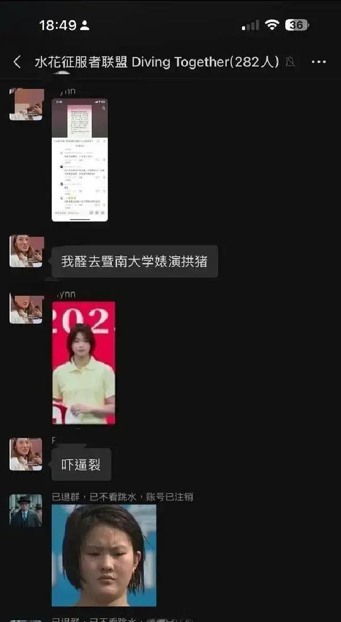 那个“水花征服者联盟”群,公告明摆着:别人别碰,就冲她开火。 每天“今日任务”轮番上,黑身材黑穿搭黑买手机给爸妈。里面混着认证媒体号和跳水圈熟面孔,他们不吭声也没走人,就那么围观,像看免费惨剧直播。群转发超五百次,浏览破五千,这规模已不是闲聊,是有组织围猎。