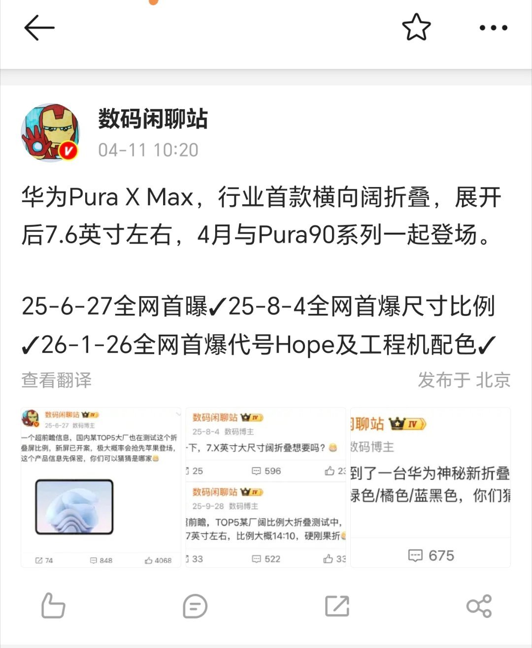 据博主 数码闲聊站 爆料,行业首款横向阔折叠华为 Pura X Max 展开后 7.6 英寸左右,4 月与 Pura 90 系列一起登场。