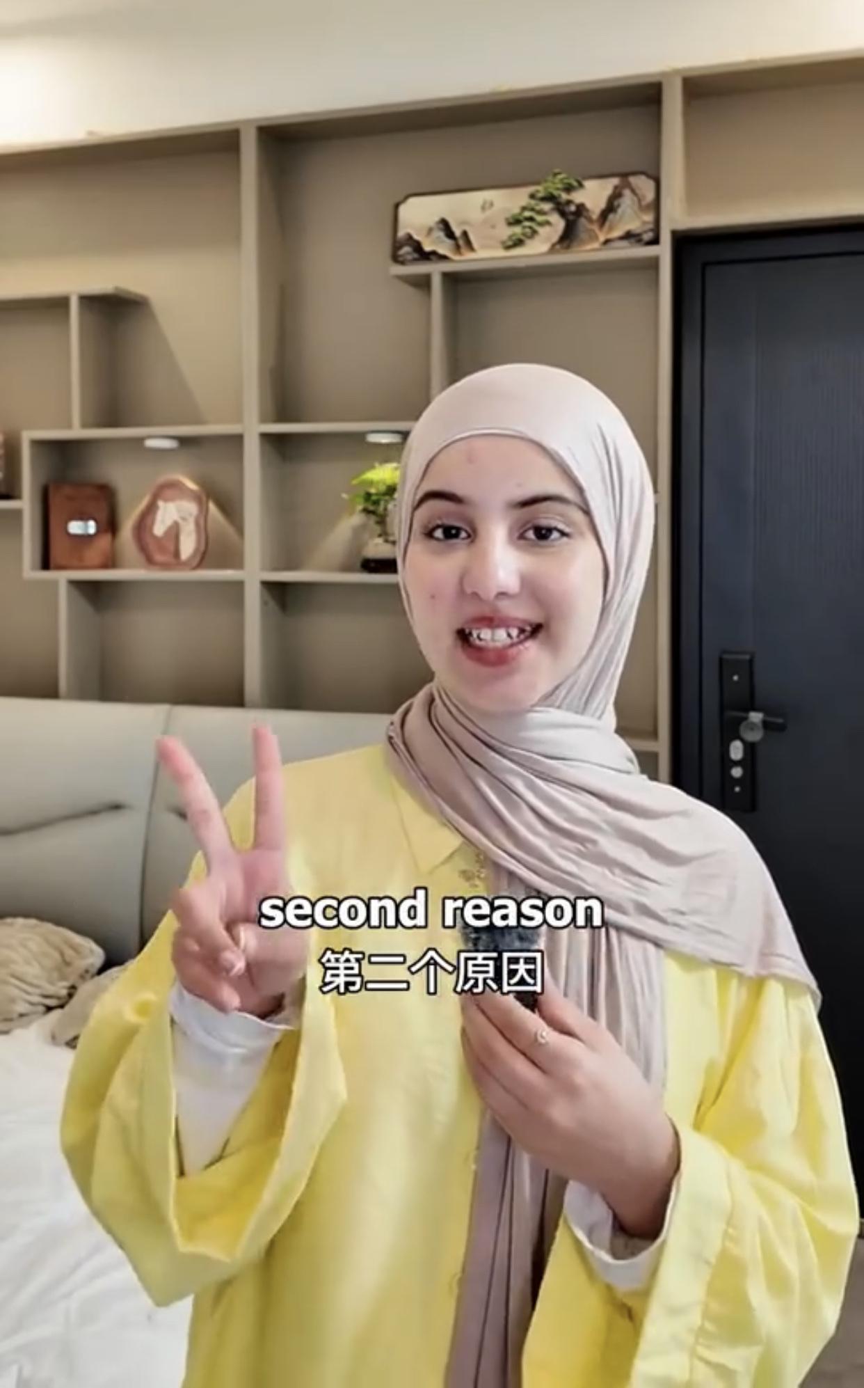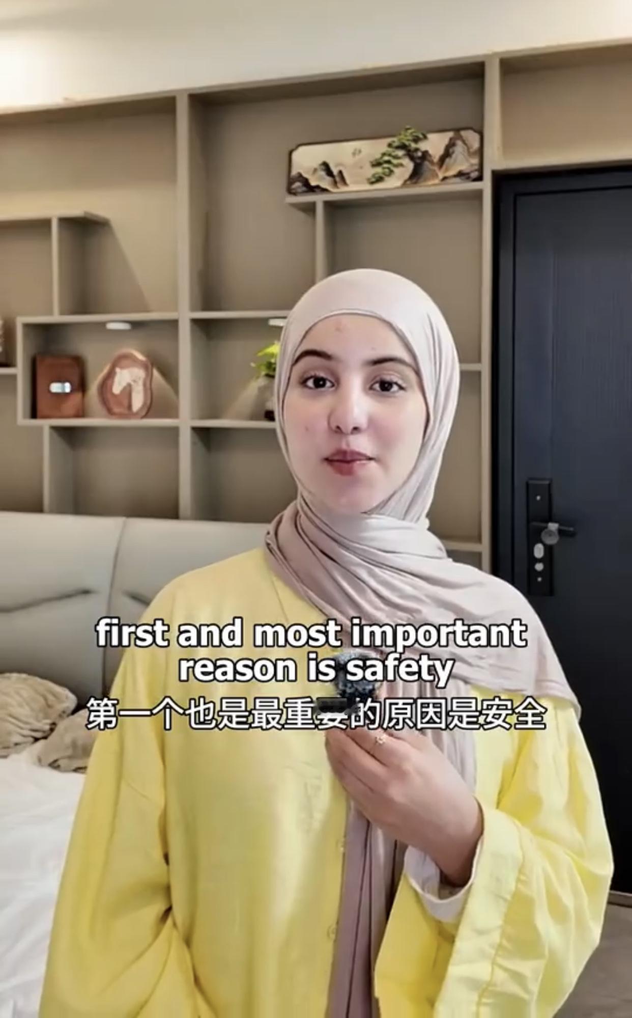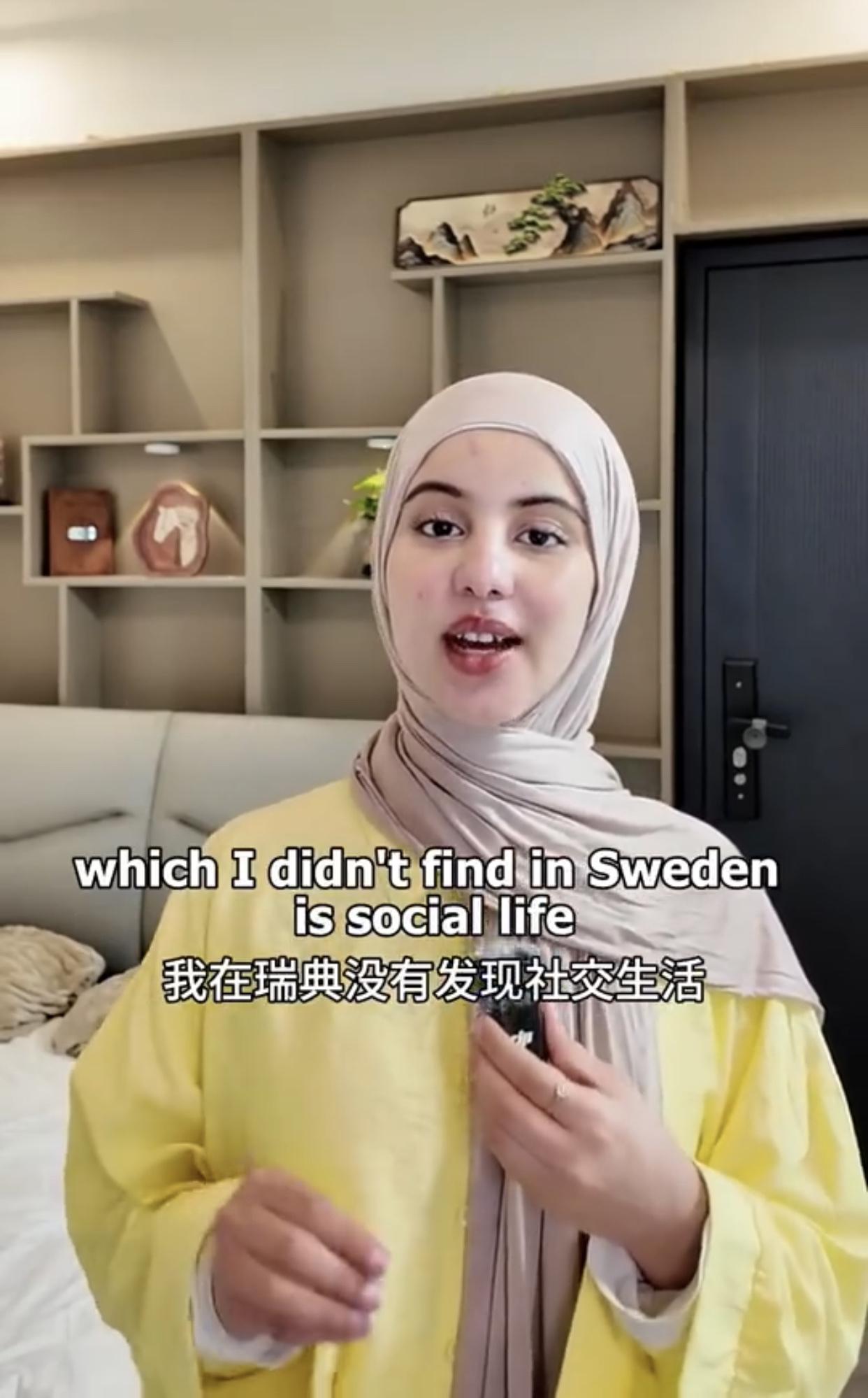 一位戴着头巾的瑞典女子解释她离开瑞典,搬到中国居住的原因:“我为什么离开瑞典搬到中国?主要原因是,第一,也是最重要的原因是这里安全,我一生中从未感受到这种程度的安全,我在中国即使凌晨2点出门,我也能感到完全安全,而如果我把手机或包放在公共场所的某个地方,我也不用担心它们会丢失,它们会在同一个地方;第二个原因,我在瑞典没有发现社交生活,而在中国,中国人非常善良和慷慨,他们中的一些人对于我来说就像是家人一样,短时间内,我在中国遇到的人数比我在瑞典多年认识的人都多;第三个原因是生活成本,这里的生活适合所有预算,如果你的预算很低,你仍然可以舒适地生活在这里;第四个原因是方便、速度和发展,中国在许多领域都很先进,在这里生活非常容易,例如,如果你想从超市买任何东西,只要打开你的手机下单,你就可以很容易地做到这一点,订单会在半个小时之内到达你那里;这些都是让我搬到中国居住的原因。”