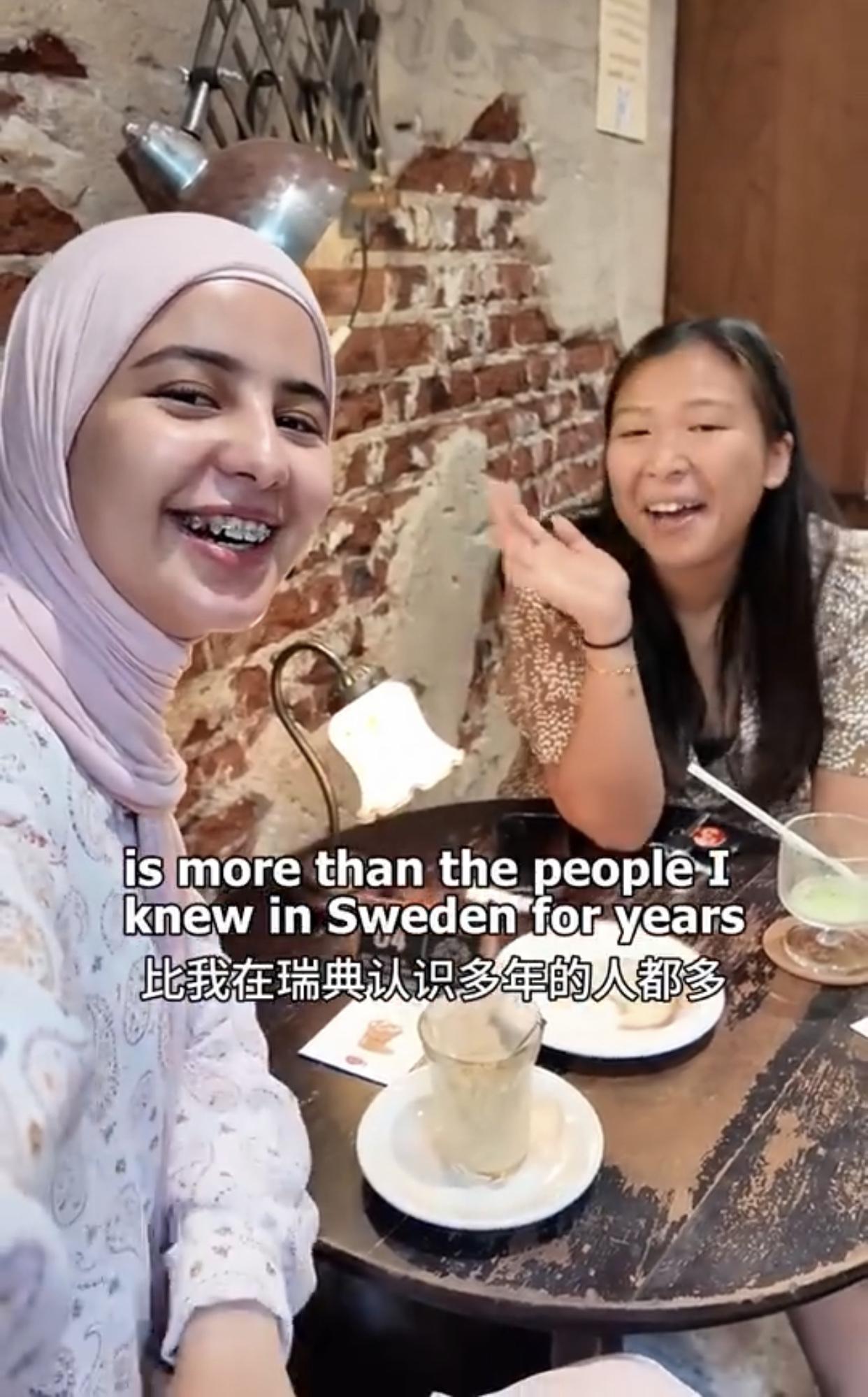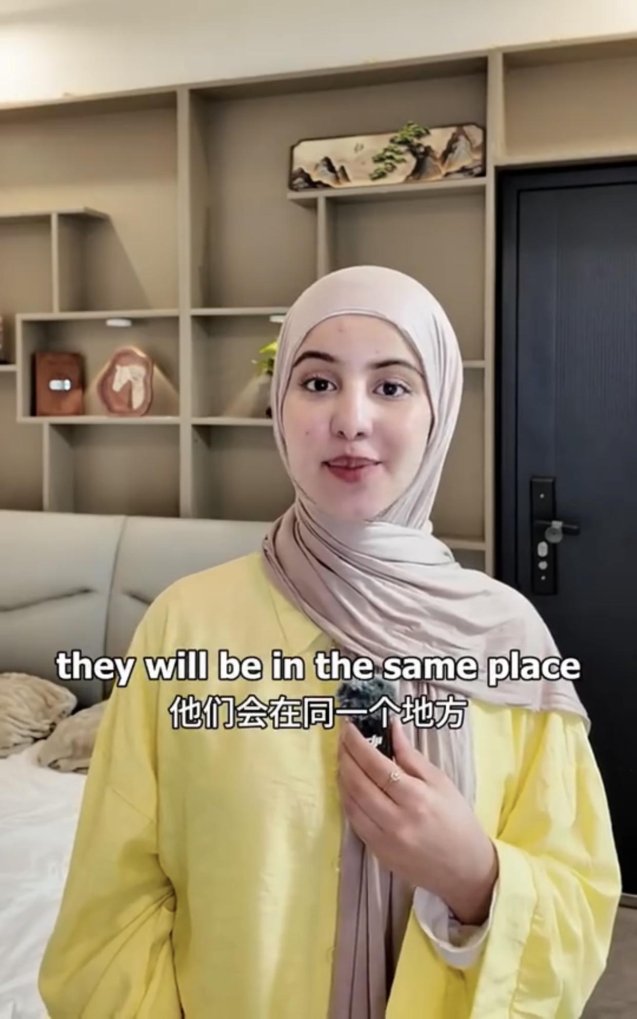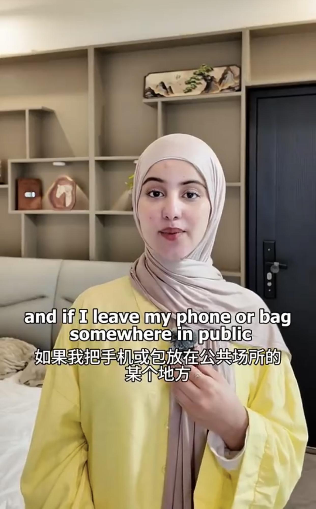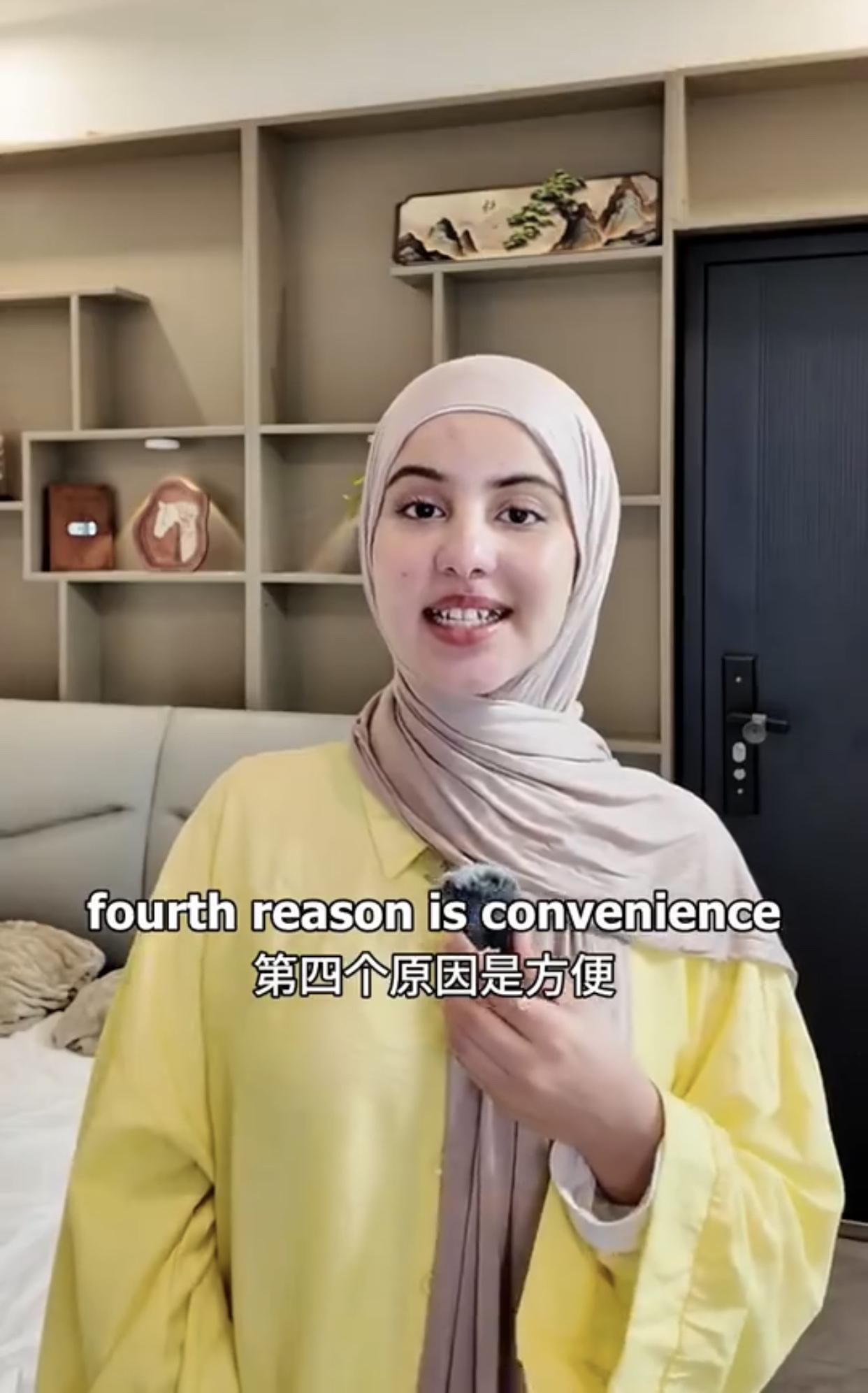 一位戴着头巾的瑞典女子解释她离开瑞典,搬到中国居住的原因:“我为什么离开瑞典搬到中国?主要原因是,第一,也是最重要的原因是这里安全,我一生中从未感受到这种程度的安全,我在中国即使凌晨2点出门,我也能感到完全安全,而如果我把手机或包放在公共场所的某个地方,我也不用担心它们会丢失,它们会在同一个地方;第二个原因,我在瑞典没有发现社交生活,而在中国,中国人非常善良和慷慨,他们中的一些人对于我来说就像是家人一样,短时间内,我在中国遇到的人数比我在瑞典多年认识的人都多;第三个原因是生活成本,这里的生活适合所有预算,如果你的预算很低,你仍然可以舒适地生活在这里;第四个原因是方便、速度和发展,中国在许多领域都很先进,在这里生活非常容易,例如,如果你想从超市买任何东西,只要打开你的手机下单,你就可以很容易地做到这一点,订单会在半个小时之内到达你那里;这些都是让我搬到中国居住的原因。”