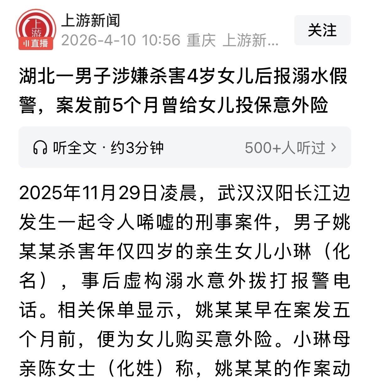 湖北武汉,男子夜里把4岁女儿带到江边,将女儿头摁入江水中,确定女儿没气后,他把女儿抛进江里,报警说女儿意外溺水了,在外地的妻子得知女儿的死讯后,崩溃不已,她总觉得事情没那么简单,而警方调查后发现,男子在事发5个月前,曾为女儿购买了意外险。