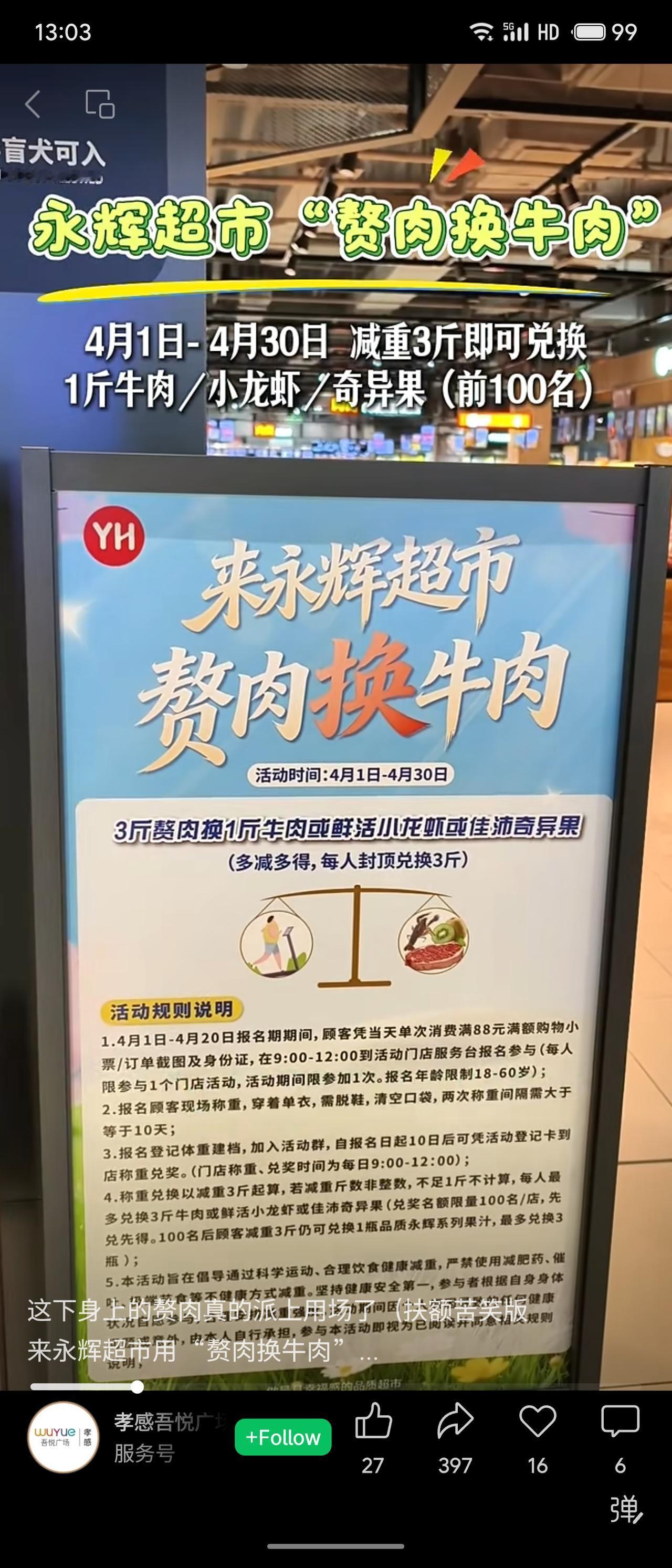 创意营销有趣,把“赘肉”变福利,鼓励健康生活。但门槛较高(满88元、限前100名),实际参与不易,噱头大于实惠。