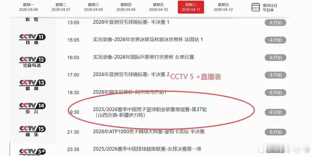 4月11日19:35,CBA常规赛收官夜5战同开,CCTV5+直播山西vs新疆。