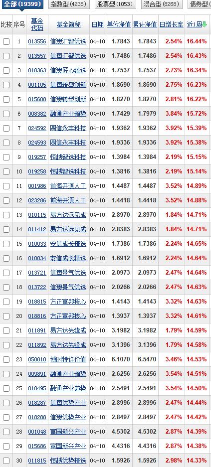 周榜历来变化都大,这次排名第一的是信澳汇智优选16.44%,信澳匠心臻选16.34%排名第二,信澳转型创新16.23%排名第三,融通产业趋势15.72%排名第四,圆信永丰科技15.39%排名第五,恒越智选科技15.15%排名第六,前海开源人工智能14.89%排名第七,紧随其后的还有易方达远见成长14.71%,安信成长精选14.65%,信澳景气优选14.64%,方正富邦核心优势14.63%,易方达先锋14.59%等。