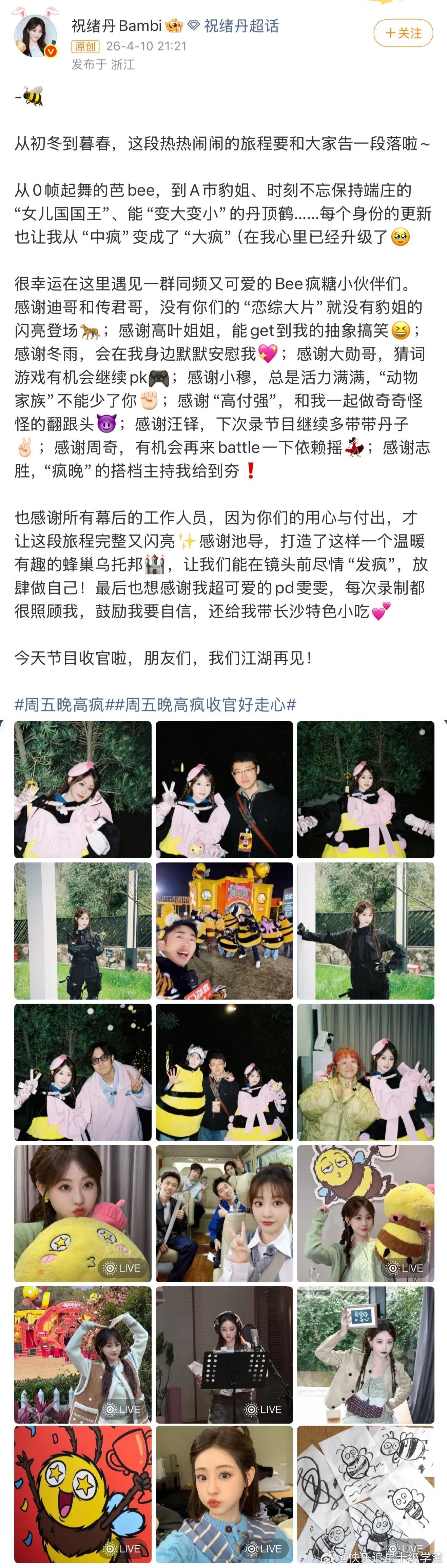 真的有被祝绪丹这篇收官长文狠狠戳到从初冬录到暮春,一段热热闹闹的旅程就这样画上句号,字里行间全是不舍和真心。她记得每一个舞台身份,从芭bee到豹姐再到女儿国国王、丹顶鹤,一路从“中疯”玩到“大疯”,看得出来是真的投入、真的快乐。也认认真真感谢了每一个人,搭档、前辈、小伙伴,甚至连pd带的长沙小吃都记在心里,温柔又细腻。不敷衍、不客套,把节目里的开心与温暖都好好珍藏,这样真诚又坦荡的女孩子,真的很难不爱。