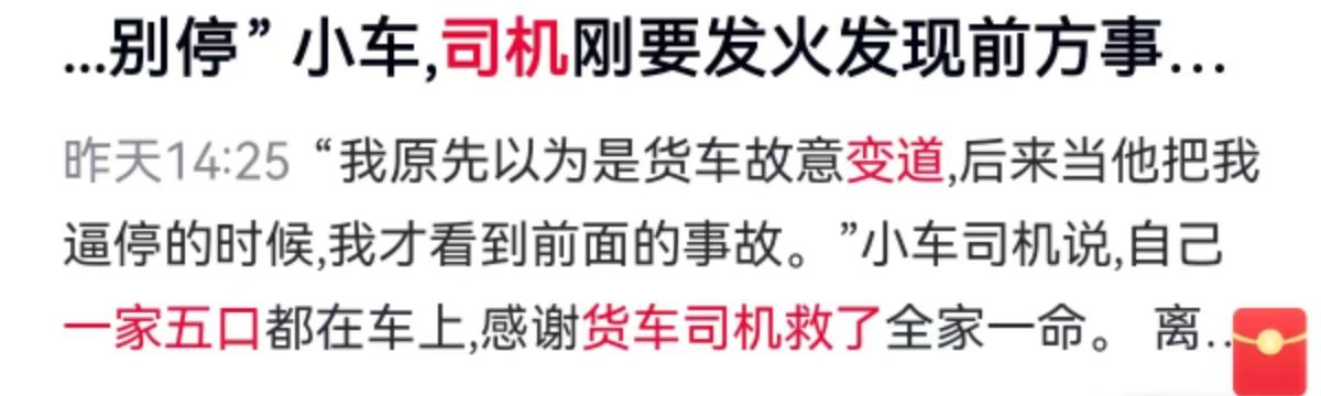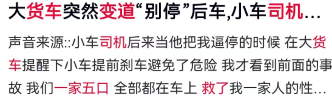 一腔感激无处安放,这件事被发到了网上,迅速演变成一场全网寻找鲁H大货车司机的接力。当事人的那句“救了我一家人的性命”,戳中了无数人的软肋。人在遭遇突发危险时,大脑往往来不及处理复杂信息,鲁H货车司机的选择非常果断:舍弃个人的驾驶体面,承担被误解甚至被投诉的风险,用最原始的物理阻挡切断了后车的危险路径。这种不废话、直接干的作风,透着老司机独有的粗犷与善良。
