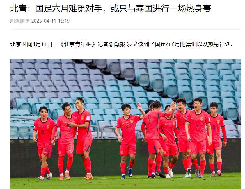 北京时间4月11日下午3点,中国足球传来突发消息,针对国足6月份热身赛,《北青体育》发文表示,国足6月在杭州只和泰国踢一场友谊赛,足协难觅适宜热身对手,而这样的情况对于国足来说,显然是个坏消息。