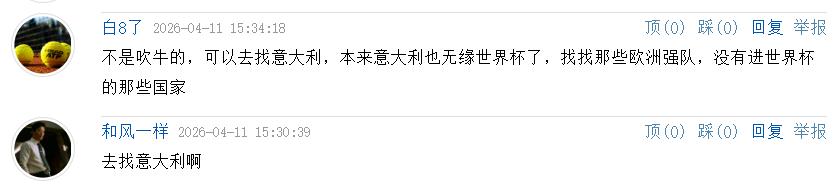 当然也有球迷表示,不是吹牛的,可以去找意大利,本来意大利也无缘世界杯了,找找那些欧洲强队,没有进世界杯的那些国家!对此,你是如何看待的呢?欢迎在评论区留言、探讨!