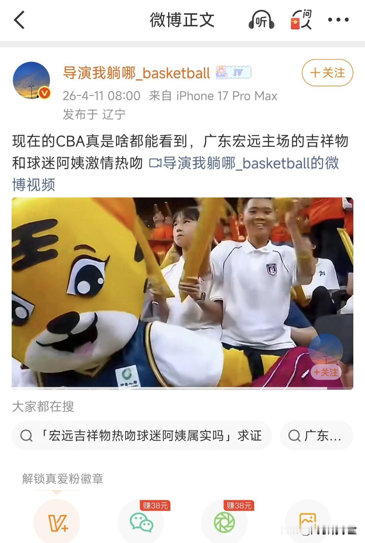 辽宁篮球博主导演质疑广东队主场吉祥物和球迷阿姨激情热吻不应该,有伤雅俗!可能在他看来,认为这是伤风败俗的行为,毕竟吉祥物的扮演者通常都是男的,正所谓男女授受不亲,不过,刚好例外,换啦啦队后,广东队的吉祥物扮演者是位女性,所以吉祥物对球迷阿姨的激情狂吻也不见得多么不雅,依我所看,吉祥物这样做反而是带动了全场气氛,调动了球迷的热情,吉祥物就应该这样,多与现场球迷互动,像NBA一样活跃点挺好的,CBA的吉祥物还是太沉闷了,缺少激情!