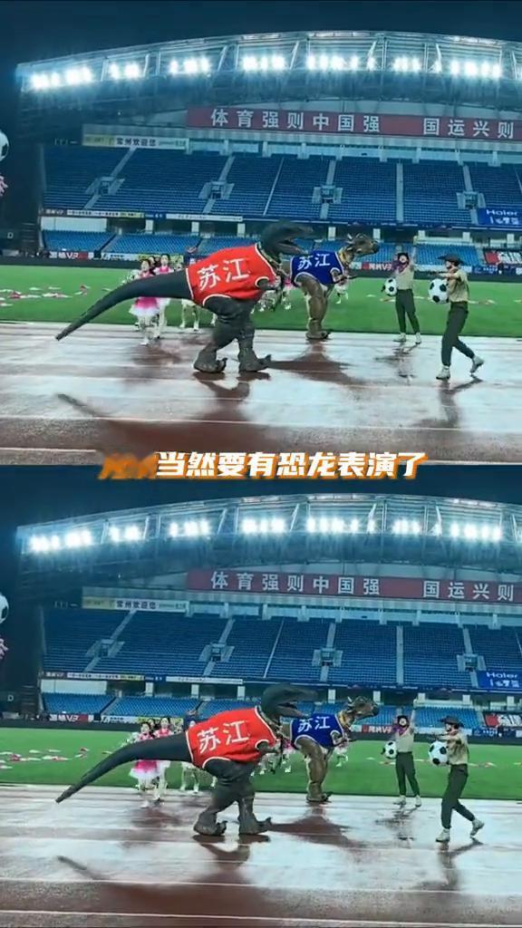 根据排练路透来看,周深将会演唱三首歌:《大鱼》、《璀璨冒险人》,还有苏超主题曲《热烈盛开》。除此之外,龙城当然要有恐龙表演了,还有恐龙版"刀马"。空中有顶着足球的长宝在飞,又因为首场长征对战南通,所以长宝在线整活,搞了个"恐龙抗狼"。不过这个龙怎么有点像酱板龙?