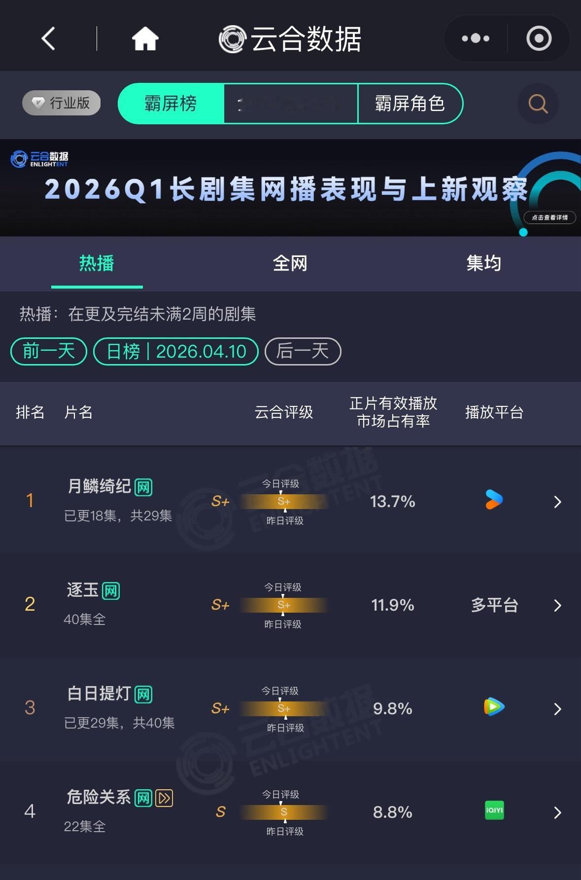《月鳞绮纪》10号云合13.7% 大盘整体低的情况下比昨天还涨了其中剧集角色露芜