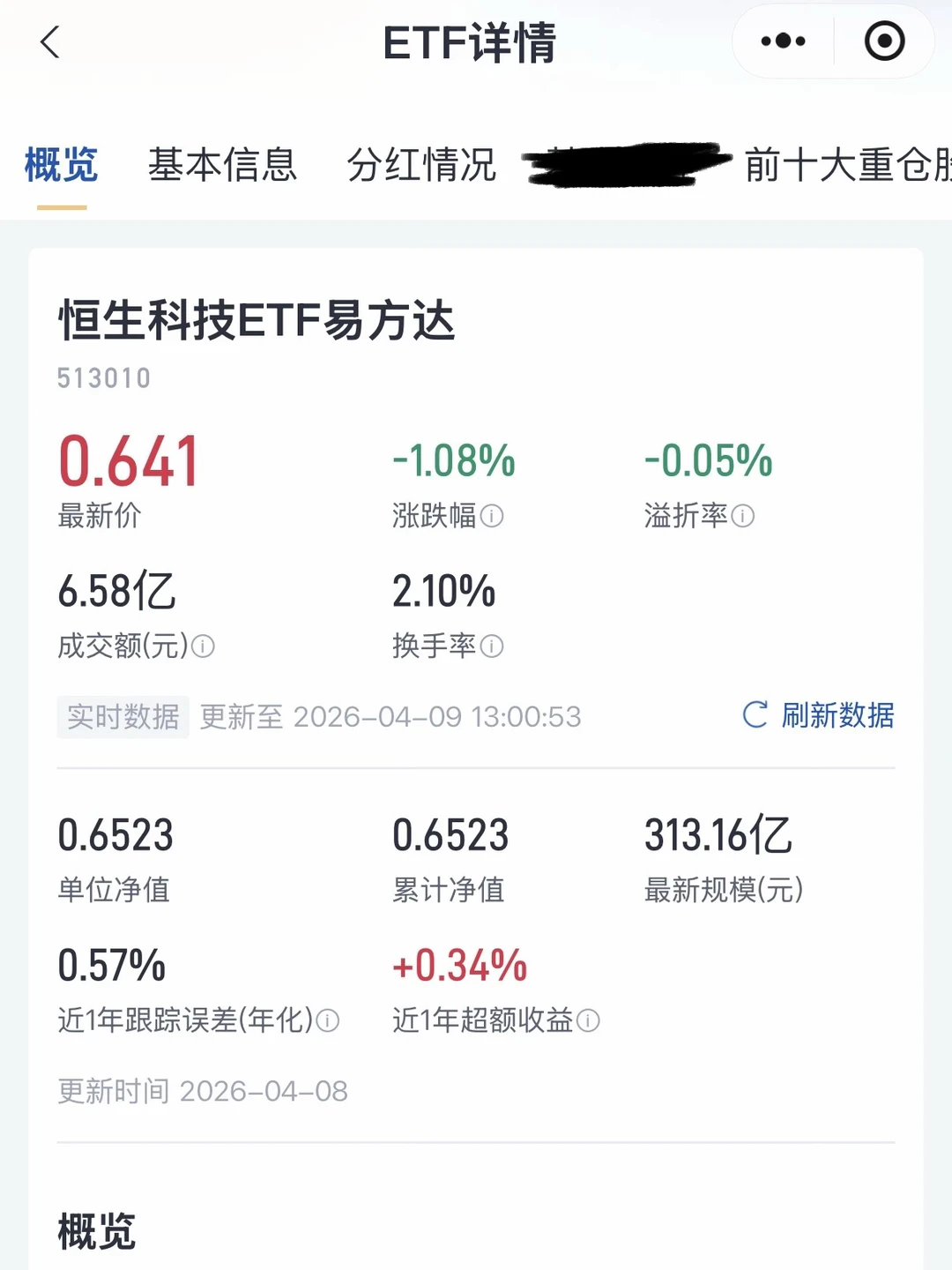 我自己在看的恒生科技ETF易方达(513010),近一年跟踪误差0.10%,虽然超额收益不高,但却是同标的百亿规模以上产品中能“跑赢”指数的ETF,说明管理上确实抠得很细。场外的可以看看易方达恒生科技ETF联接基金(A/C:013308/013309)。