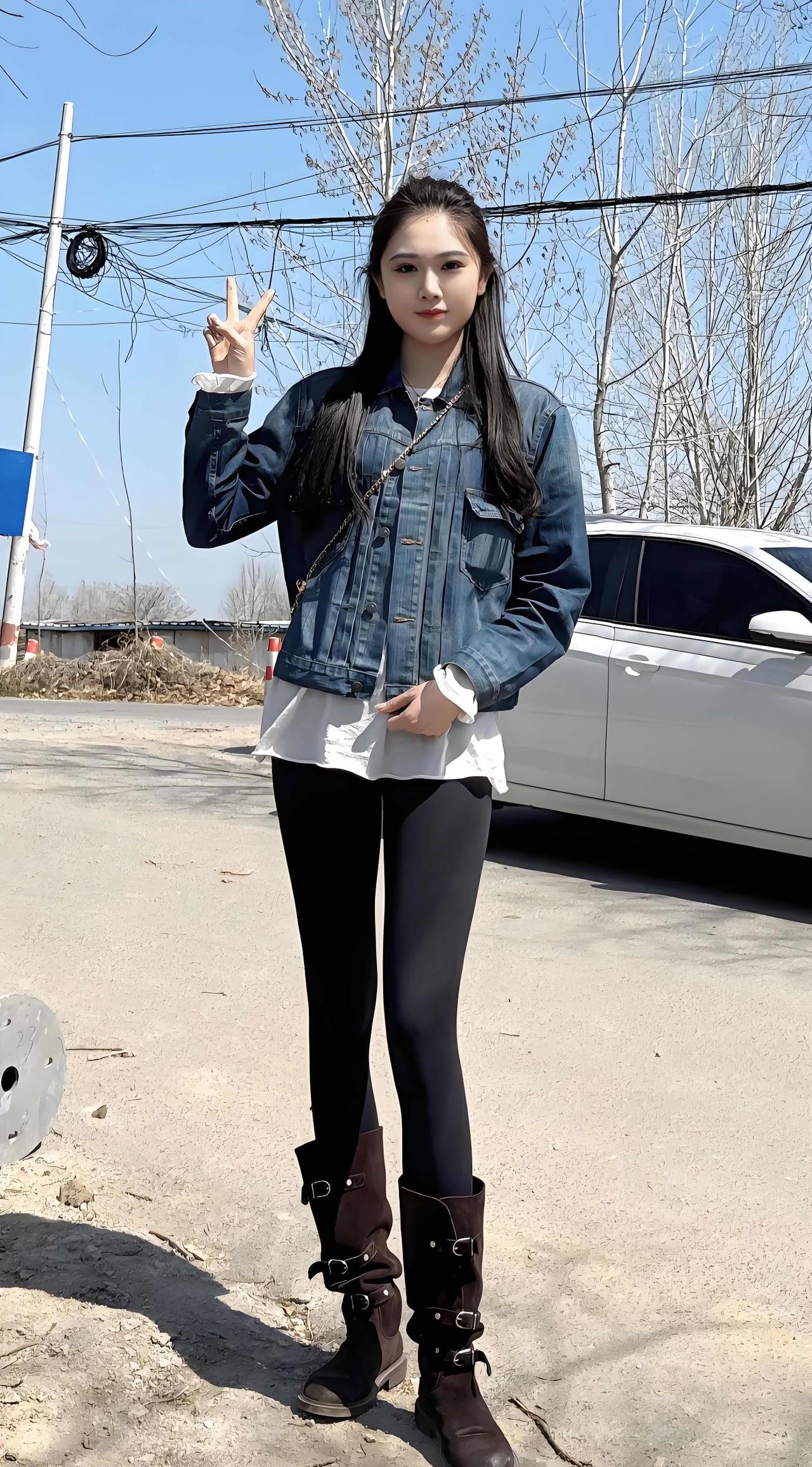 牛仔外套+黑色紧身裤,青春活力,V字手势,元气满满!