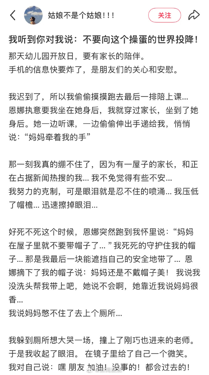 她在文末写道:“我是个不配得感很强的女孩子,每当收到大家那么多的留言和私信的问候时,我不知该如何回馈你们。但我真的很感激。”
