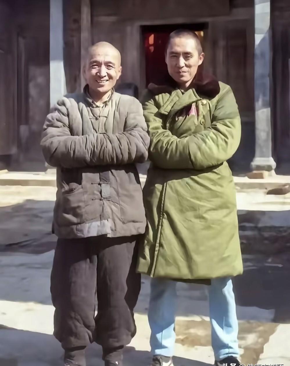 一张随手拍下的工作照,左边站着紧张到手脚不知怎么放的傅彪,右边是叼着烟的李保田和一身长衫的孙淳,中间是盯着监视器的张艺谋。