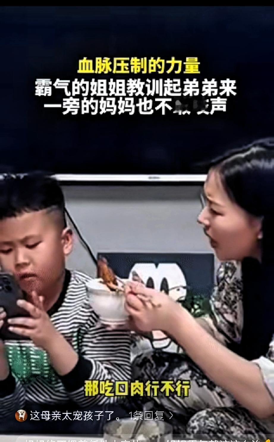 一旁的姐姐将这一切看在眼里,实在看不下去,便轻轻把碗放在弟弟面前的桌上。妈妈见状,小声提醒弟弟姐姐来了,让他好好吃饭,可弟弟并不在意,依旧自顾自玩着手机。