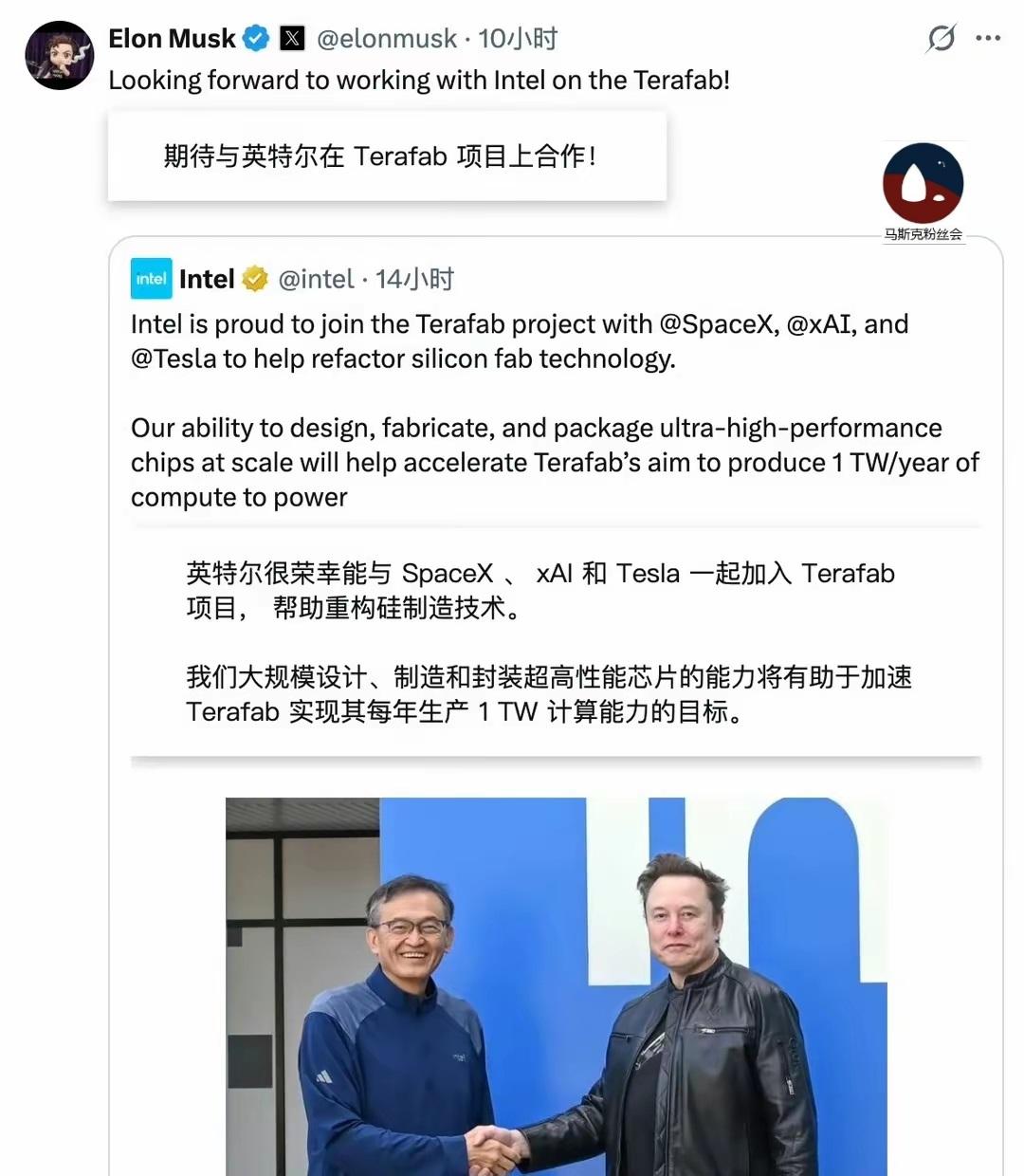 马斯克发帖表示, 非常期待跟Intel, 在terafab项目上, 的合作。 拭