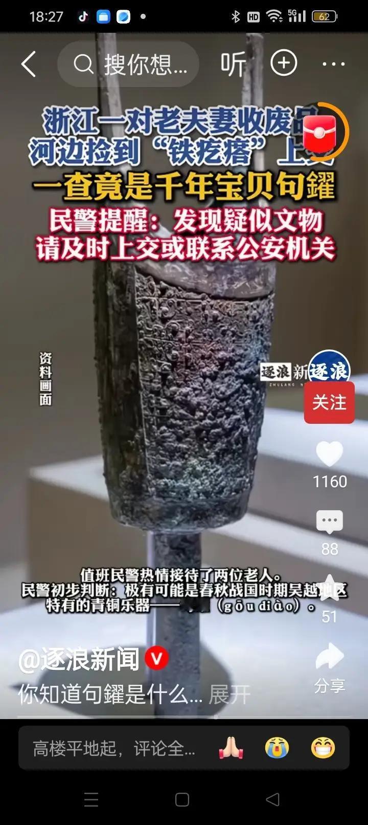 据悉这文物堪称国宝,属于无价之宝,叫做句鑃(gōu diào)是春秋战国吴越地区特有的青铜礼乐乐器。