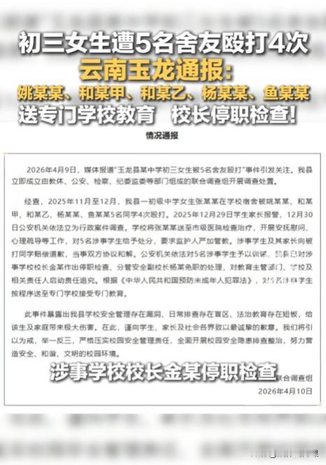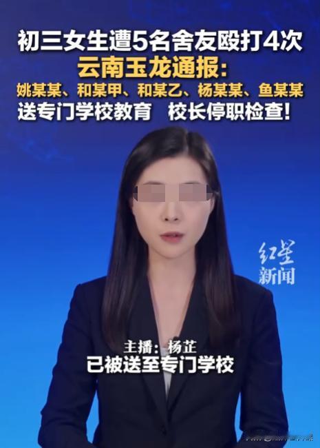 “最新消息!”云南丽江,一15岁女学生遭到同宿舍5名舍友的长期辱骂殴打,为了不再被欺凌,她请假逃回了亲戚家。父亲得知后报警求助,但警方表示无法对这5名学生进行处罚,希望女生父亲能同意调解。无奈之下,女生父亲接受了其中4名学生家长的道歉,以及1.9万元赔偿。女生父亲转而要求学校惩戒这5名学生,但学校研究了3个多月,至今未对5名学生的行为定性,而教体局却表示学校已经尽力了。目前,最新通报来了,5名施暴学生、学校负责人以及教育部门负责人都受到了相应的处罚。