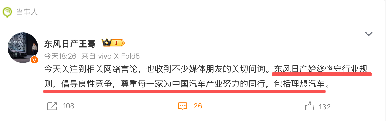 东风日产高管回应李想喊话东风日产高管称尊重每一家同行 似乎还可能真被我们前一个帖
