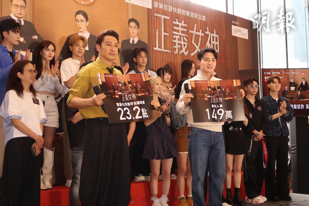 譚耀文、周嘉洛、蔣祖曼、馬貫東、劉倬昕、樂珈嘉、倪嘉雯及康華等今日齊集商場為無綫劇集《正義女神》宣傳,眾人試食「加料」三文治,配合劇情。主角佘詩曼因有工作在身,未能出席,用預錄形式亮相解構劇情。會上公布首集7天跨平台總收視23.2點,獲149萬觀眾收看,暫列2026年翡翠台劇集收視之冠。劇集總監製鍾澍佳將60歲生辰,大會送上得意造型蛋糕及一套有多名藝員簽名的閃卡作為禮物,他的生日願望是未來創作更多出色作品。