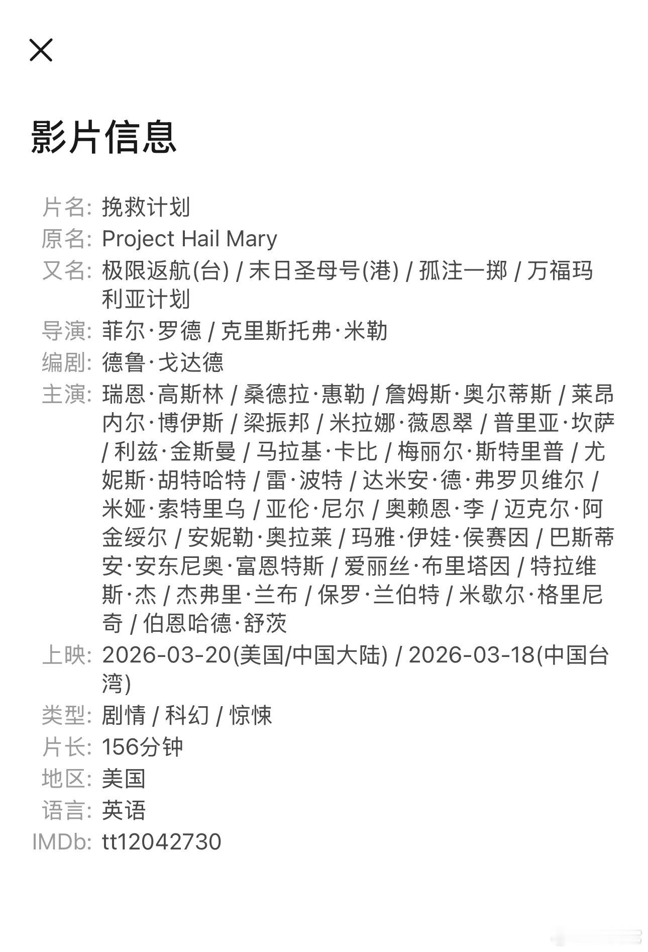 📌 挽救计划(Project Hail Mary),原著作者Andy Weir本人是程序员出身,写《火星人》和《挽救计划》之前都做了大量科学调研。原著《挽救计划》赢得了雨果奖最佳长篇小说 ,不是靠情节爽感,而是靠科学细节的密度和可信度。
