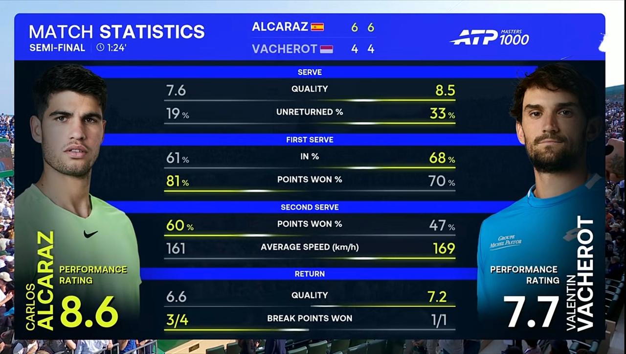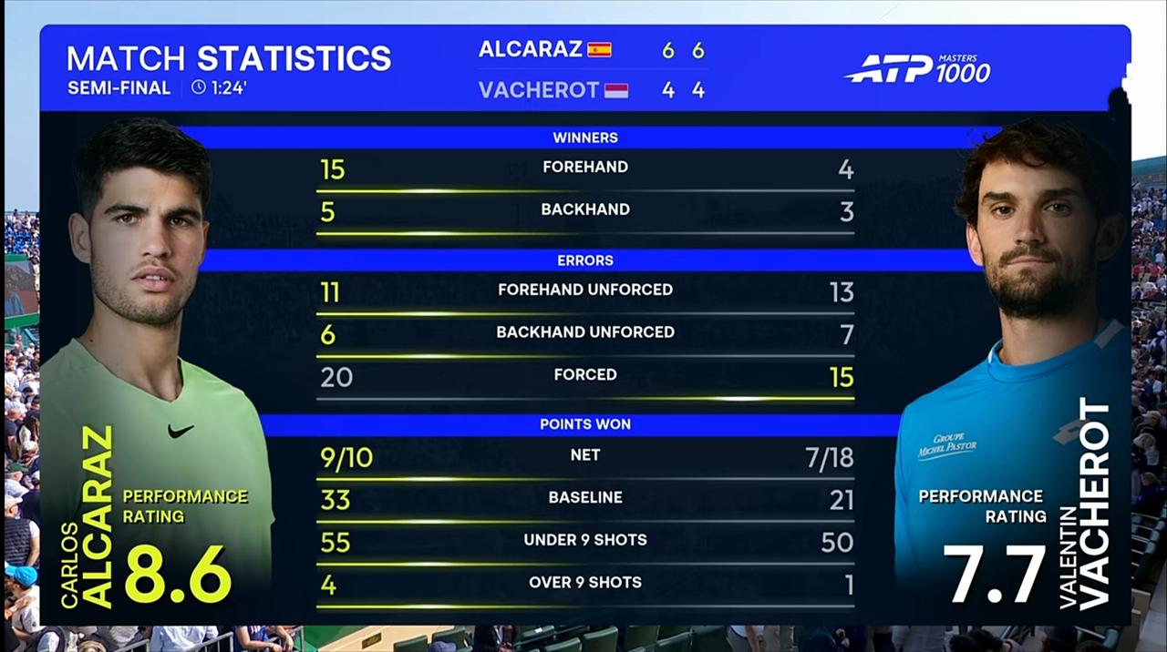 6:4,阿尔卡拉斯再下一城。大比分2:0,阿尔卡拉斯完胜表弟瓦舍罗,晋级决赛,与辛纳成功会师。